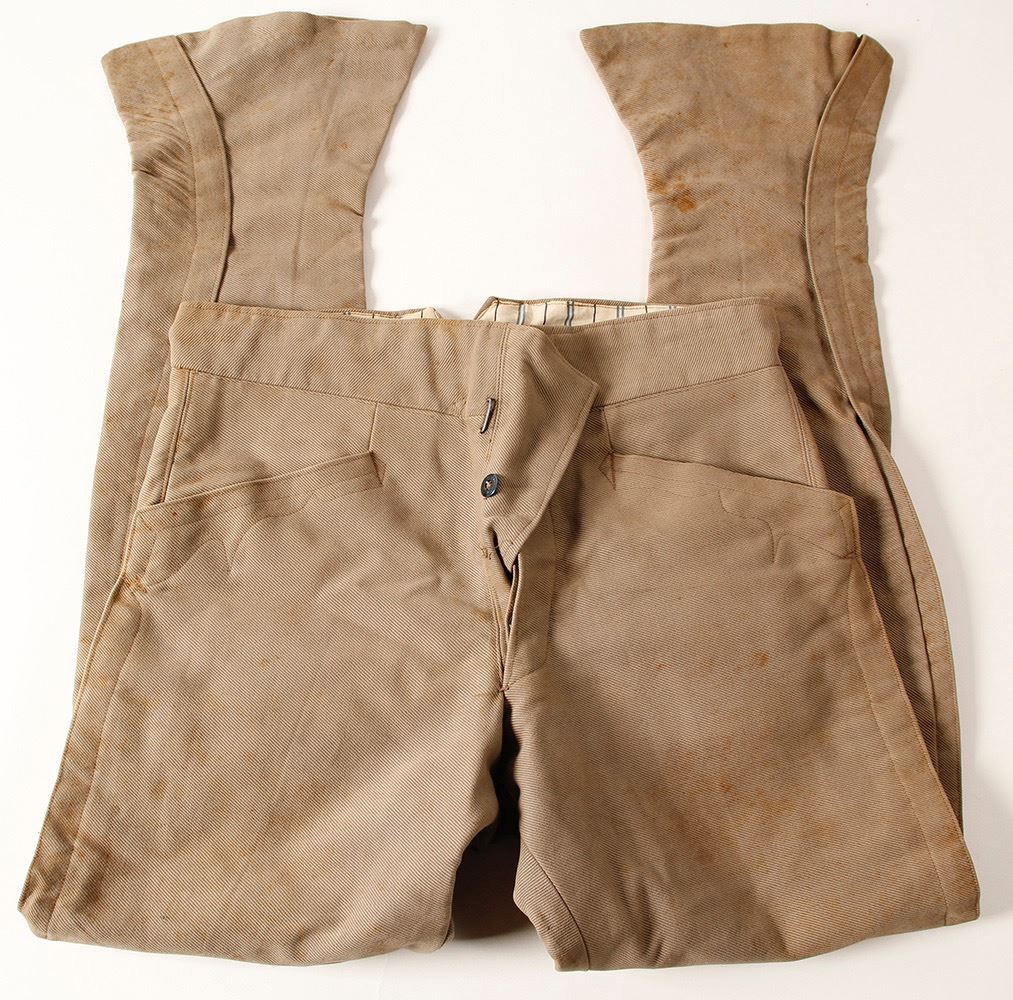 Pair of men's Vaquero style pants, buttons appear to be CW, but material more like 1880's came out of Laredo Texas, in the early 1990's. Back buckle, very sound, a few rust stains. Date: Location: Laredo, Texas HWAC# 57514