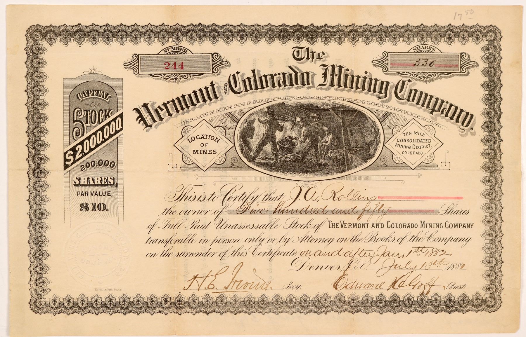 Location of Mines: Ten Mile Consolidated Mining District, Colorado (printed on either side of vignette). No. 244, issued for 550 shares to JA Rollins on July 13th, 1881 in Denver. Signed by president Edward H Goff and secretary HE Irvine. Not cancelled. Black border and print, underground mining vignette. Printed by Hamilton Print, Boston. Deep horizontal and vertical folds with 3 tears, toning. 7.5 x 11.5" Not listed in C&L or CHNC. An ad for the company in the July 14th, 1881 Vermont Standard states that they have 160 acres near celebrated claims such as the Robinson Consolidated, Wheel of Fortune, and White Quail. The Tenmile District was first identified by Hollister (1867) and described as all the sections drained by Tenmile Creek. It was listed by Henderson (1926) as the Consolidated Tenmile, and he included within it the Wilkinson, Frisco, Robinson and Kokomo Districts. Ken Prag Collection
