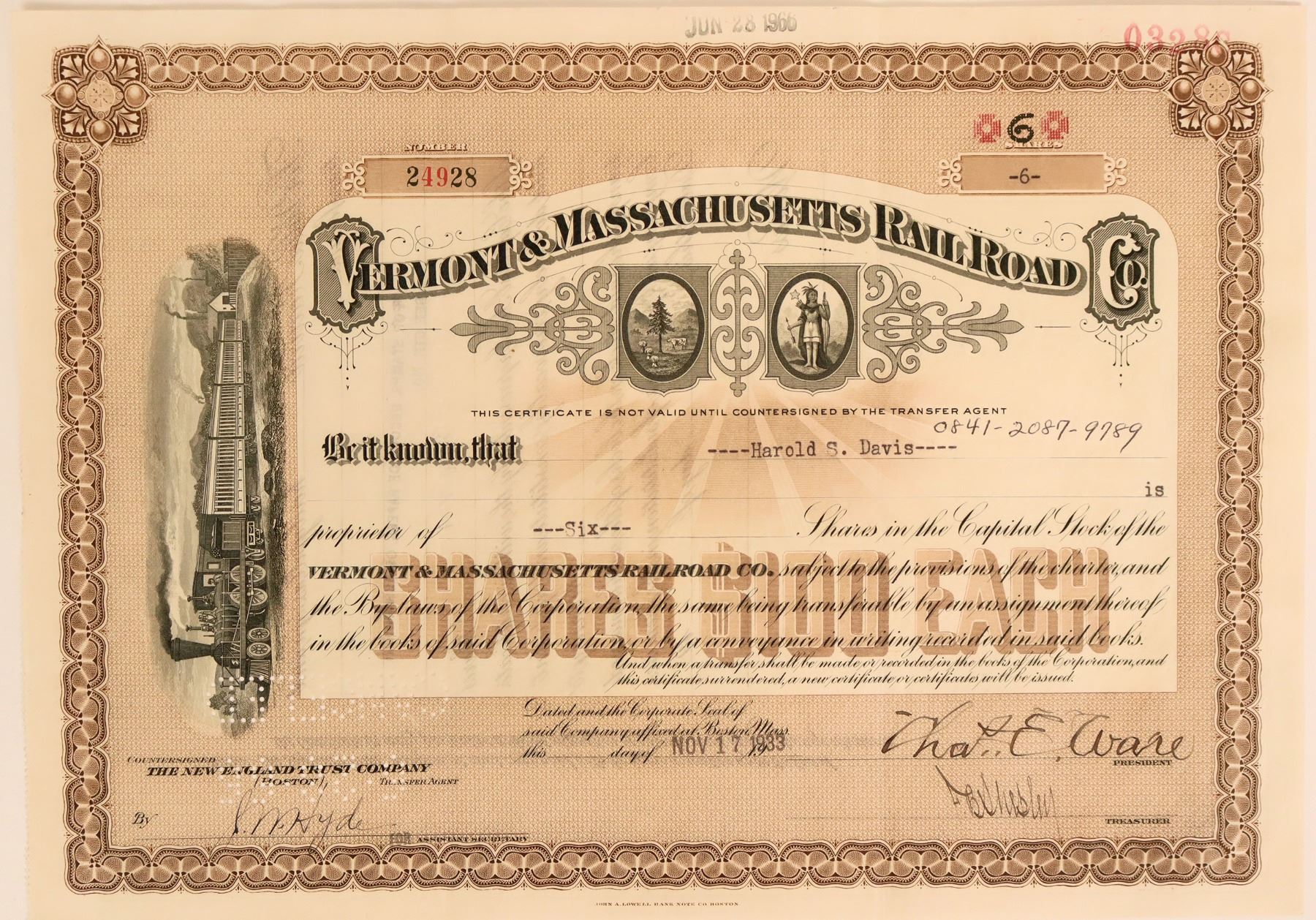 Chartered in 1844 and immediately merged the Brattleborough and Fitchburg Railroad of Vermont into itself. Operating in Vermont and Massachusetts. #24928, I/C, 6 shares@ $100 ea. issued Nov 17, 1933. Signed Char E. Ware President. Brown, embossed seal vignettes: top both state seals, left column train top to bottom rounding bend. SHARES $100 EACH brown underprint. John A. Nowell Bank Note Co. 1917 only known date of issue (Cox). VF