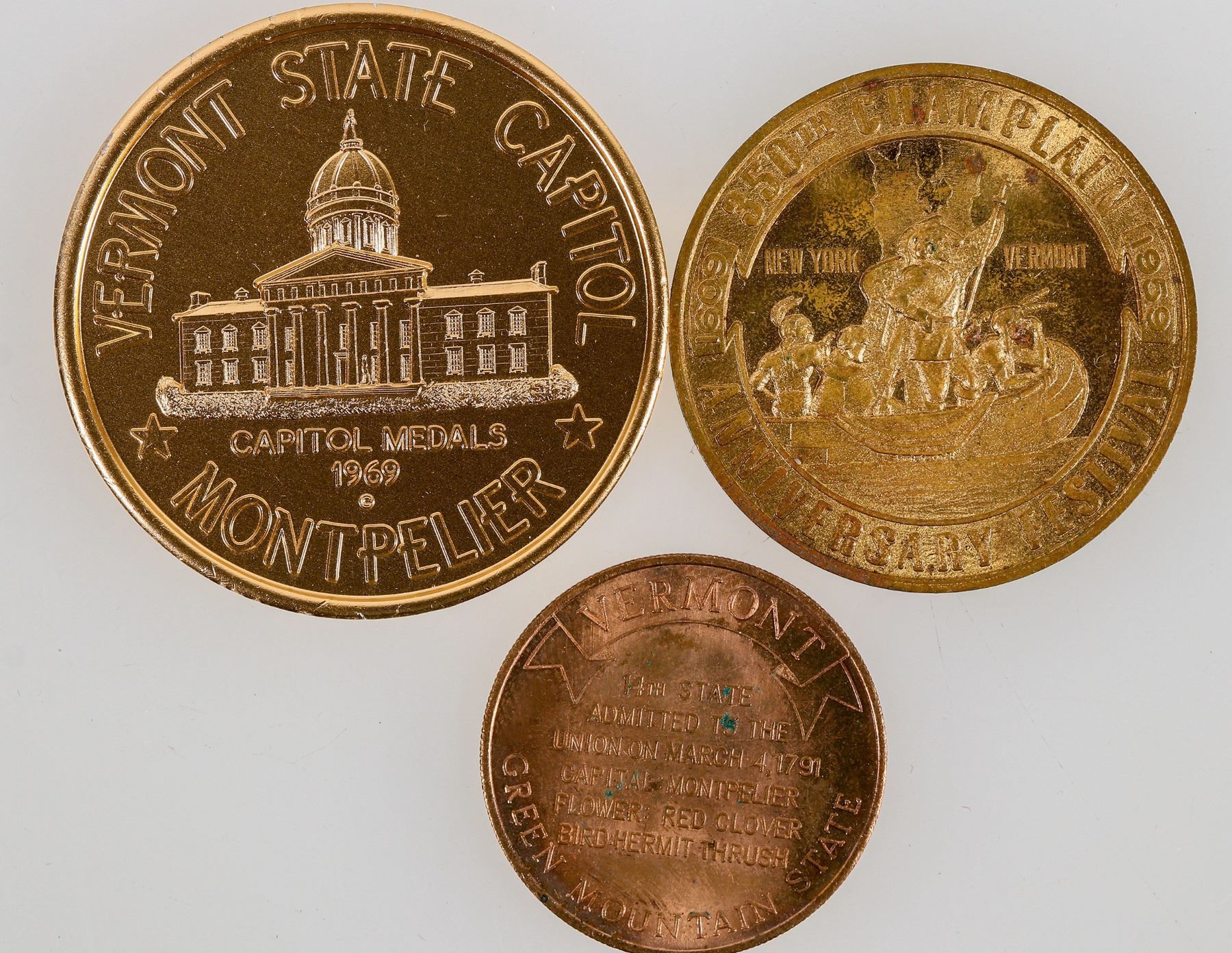 Vermont medals in a ranging from gold to bronze coloration. Two of the coins are lightly worn, though the largest coin, which depicts the State Capitol is in very good condition with vibrant gloss and no rusting or apparent scratching; see photo.
