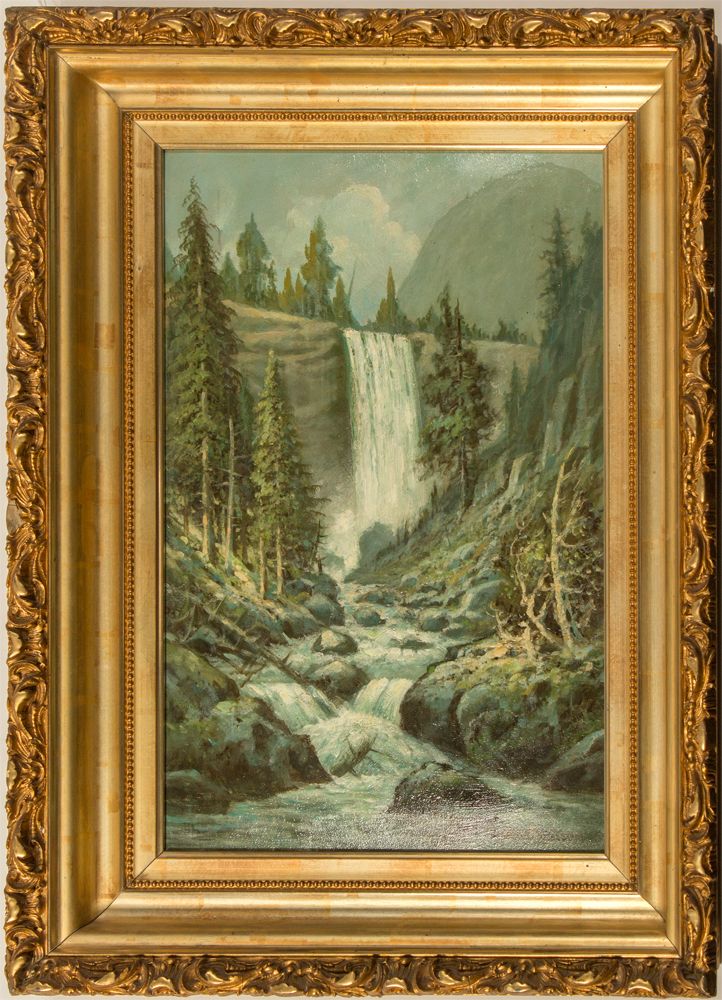 Oil on board, painting of Vernal Falls in Yosemite with storm clouds rising in the background. Original frame—