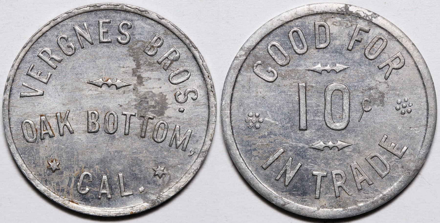 Obv.: Verones Bros. / Oak Bottom / Cal., Rev.,: Good For / 10c / In Trade; Wm, rd., 21 mm.
