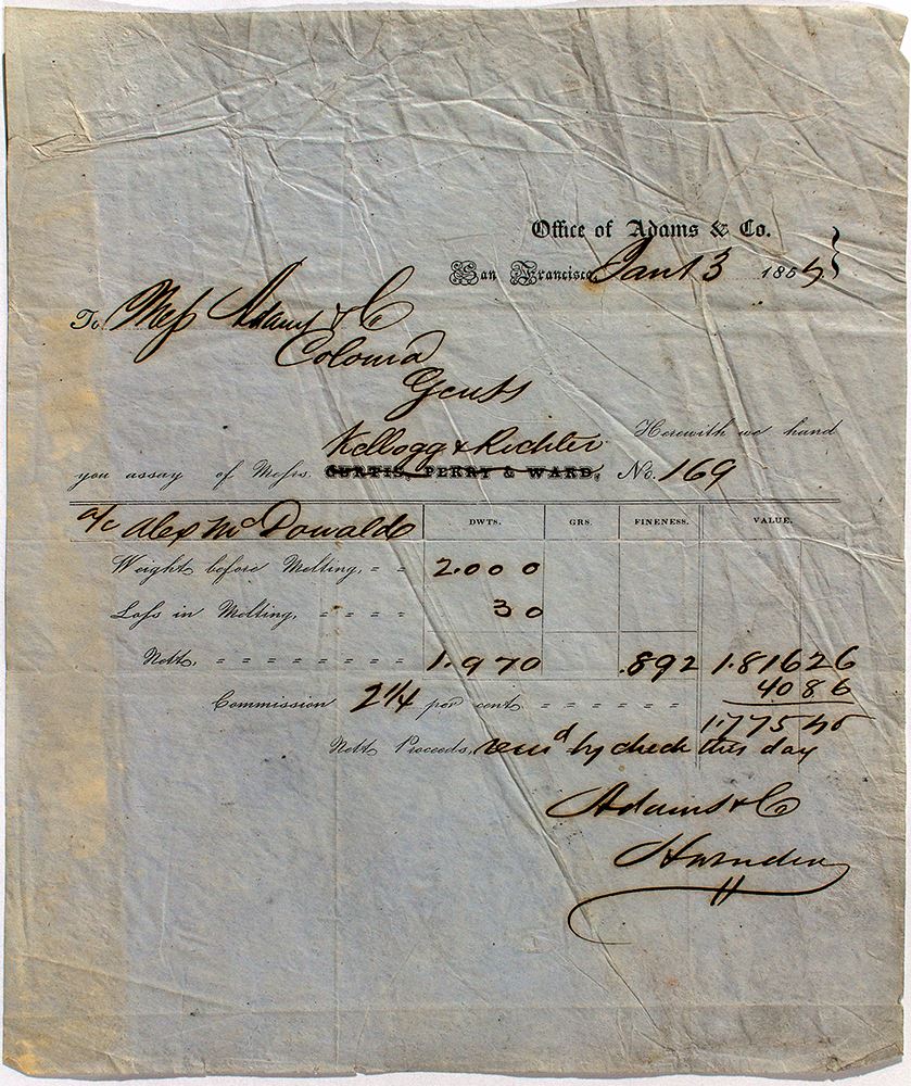 Receipt 169 for Adams & Company for an assayed sample of gold dust valued at $1,816. 26 by Kellog & Richter, sucessor to Curtis, Perry & Ward (USAO-SF). Document measures 6x8 3/4" and is printed on blue paper. Rough right edge. Small hole in upper left corner. Extremely RARE.