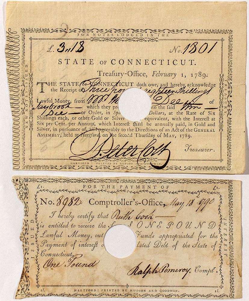 Two pieces. 1) State of Connecticut Treasury Office, Six Shillings, Feb. 1, 1789. Measures 5" x 7." and 2) Comptroller's Office, One Pound, May 18, 1790. Measures 3.5" x 5.5." Both documents were printed by Hudson and Goodwin in Hartford. Both have been punch cancelled. Minor foxing occurring, as expected for items of this age. Great early American pieces! (Prag Collection)