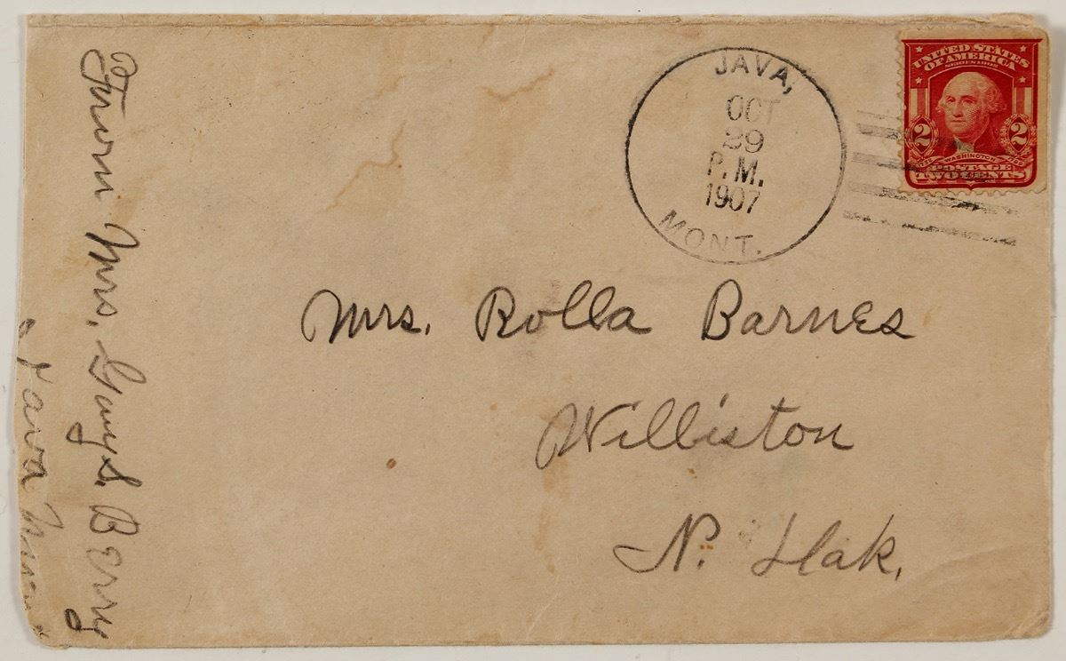 Post office was only open for 3 months when this cover was sent. Post office open from 1907 to 1913. From Mrs. Gary S. Berry. Nice strike with a four bar killer. City: Java State: Montana Date: 1907 ID: 36831
