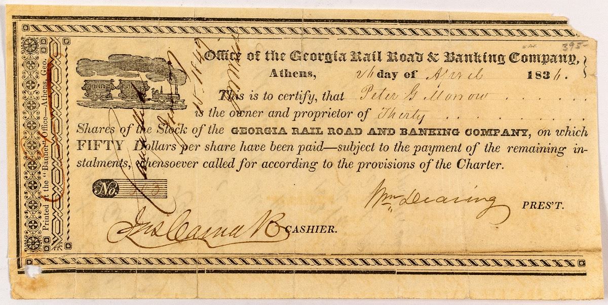 Very early small stock certificate issued in 1836 for thirty shares. Signed by Wm. Dearing as president. Small train illustration. Pen cancelled with some tears and soiling. The Georgia Railroad Company was chartered in 1833 to build a railroad from Athens to Augusta. Banking was added in 1836. This proved to be the more rewarding business, so they leased their railroading operations and became one of the strongest banks in Georgia. [Ref: http://railga.com/georgia.html] Prag Collection) City: Athens State: Georgia Date: 1836 hwac# 33921