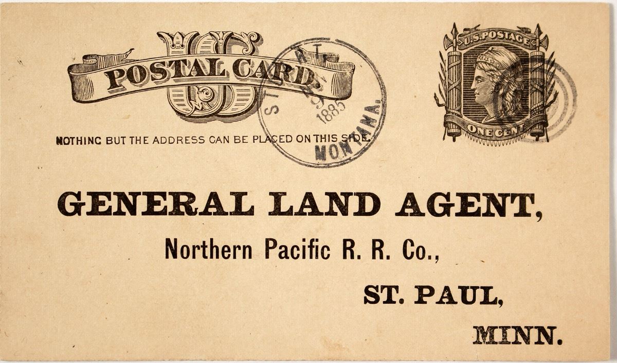 On a General Land Agent, Northern Pacific Railroad postal card. For Johnathon W Hammer and Evan Evans. Post office was open from 1882 to 1916. Three double rings listed in Shellen & Dunn. Five total. City: Stuart State: Montana Date: 1885 ID: 37034