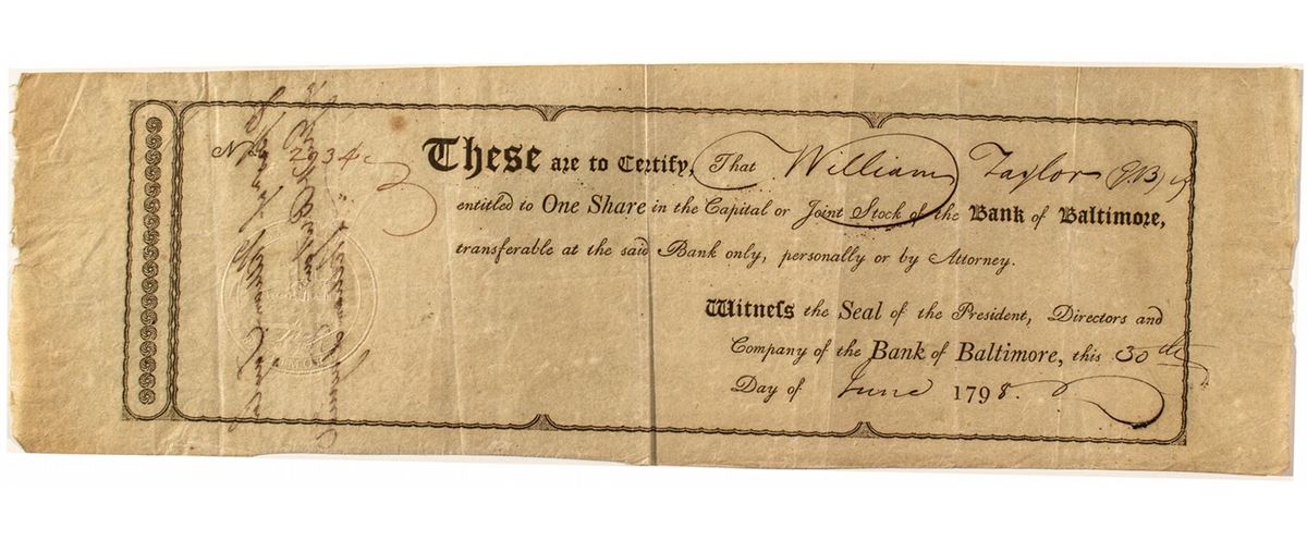 One share of stock issued to William Taylor (of Great Britain) on June 30th, 1798. Seal with ship vignette on left side. Measures approx. 4" x 13" on delicate paper with folds and minor foxing. The Bank of Baltimore was the seventh American bank in the United States, the second in Baltimore. It was chartered in 1795 because of increased need for capitol with the intention that it would be later consolidated into the Bank of Maryland. Its first president was George Salman. In 1802, the bank received support from president Thomas Jefferson who was worried that the United States Bank, whose stock was mostly owned by foreign subscribers, would swallow up smaller banks like the Bank of Baltimore and could become a liability in the event of a future foreign conflict. In 1865, it was reorganized as The National Bank of Baltimore. A reference to the bank is also found in Jedidiah Morse's The American Universal Geography (1802): "A new bank was established by law in 1796, with a capitol of 2,000,000 of dollars, called The Bank of Baltimore." (Prag Collection)
