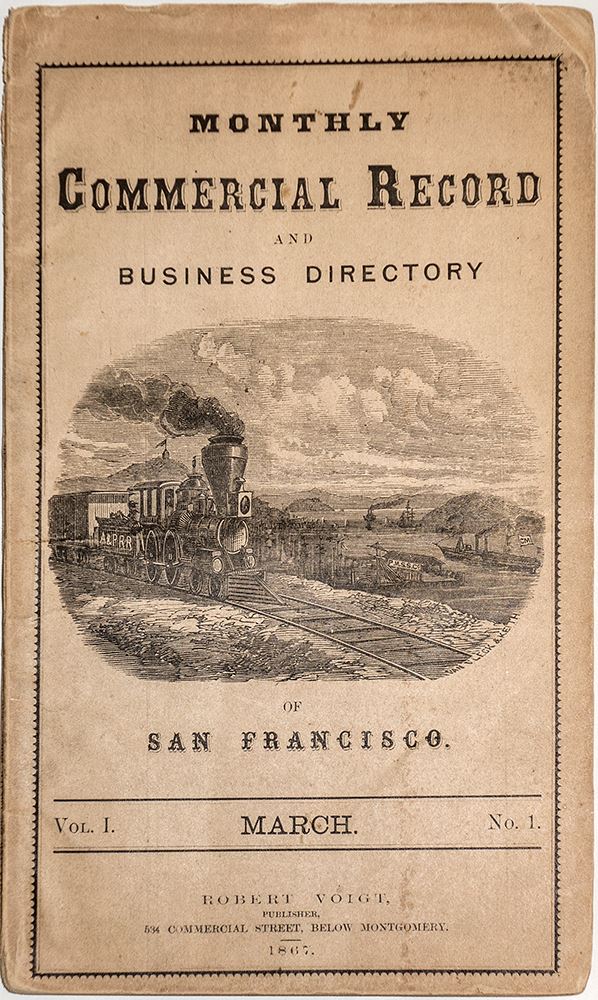 We have never seen this directory before! "Monthly Commercial Record and Business Directory of San Francisco." March 1867. Volume 1, Number 1, by Robert Voigt, Publisher, 534 Commercial Street, Below Montgomery. Printed by D. Bruce. 43 pages. Vignette on cover of A&PRR locomotive. According to the back cover, the Commercial Record was a tri-weekly publication for the "use of business men." Businesses are listed by occupation starting on page 17. Includes listings for railroads, steamships, and hacks & cabs. Curiously, the only mining company listed is New York Milling & Mining Company. This is perhaps the same company as the New York Silver Mining Co. which operated in Austin, Nevada. Softcover with some creases and toning. Binding tight. 7.75" x 4.5"