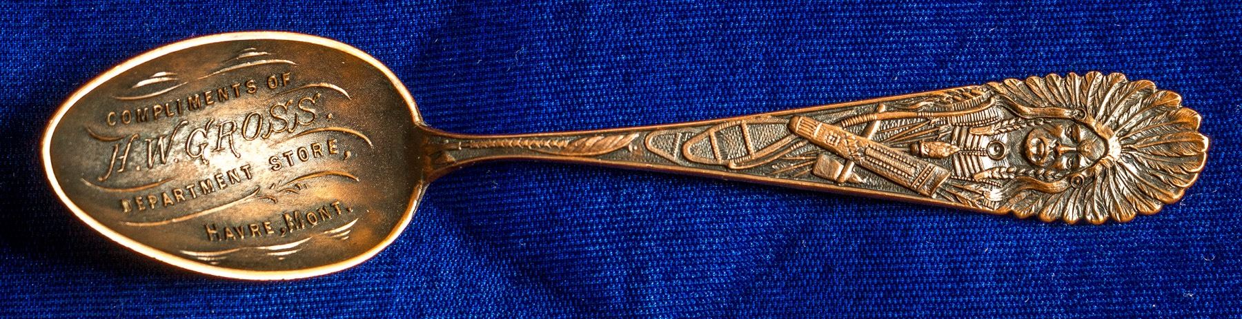 Very rare embossed copper advertising spoon compliments of H.W. Gross. Department Store, Havre Mont. Indian chief embossed on the handle with a full headdress, bow and arrows, snowshoes, tomahawk, snowshoes, sword, and oars. Beautiful mint condition. 1.04 Oz. State: Montana City: Havre HWAC#: 40878 Date: