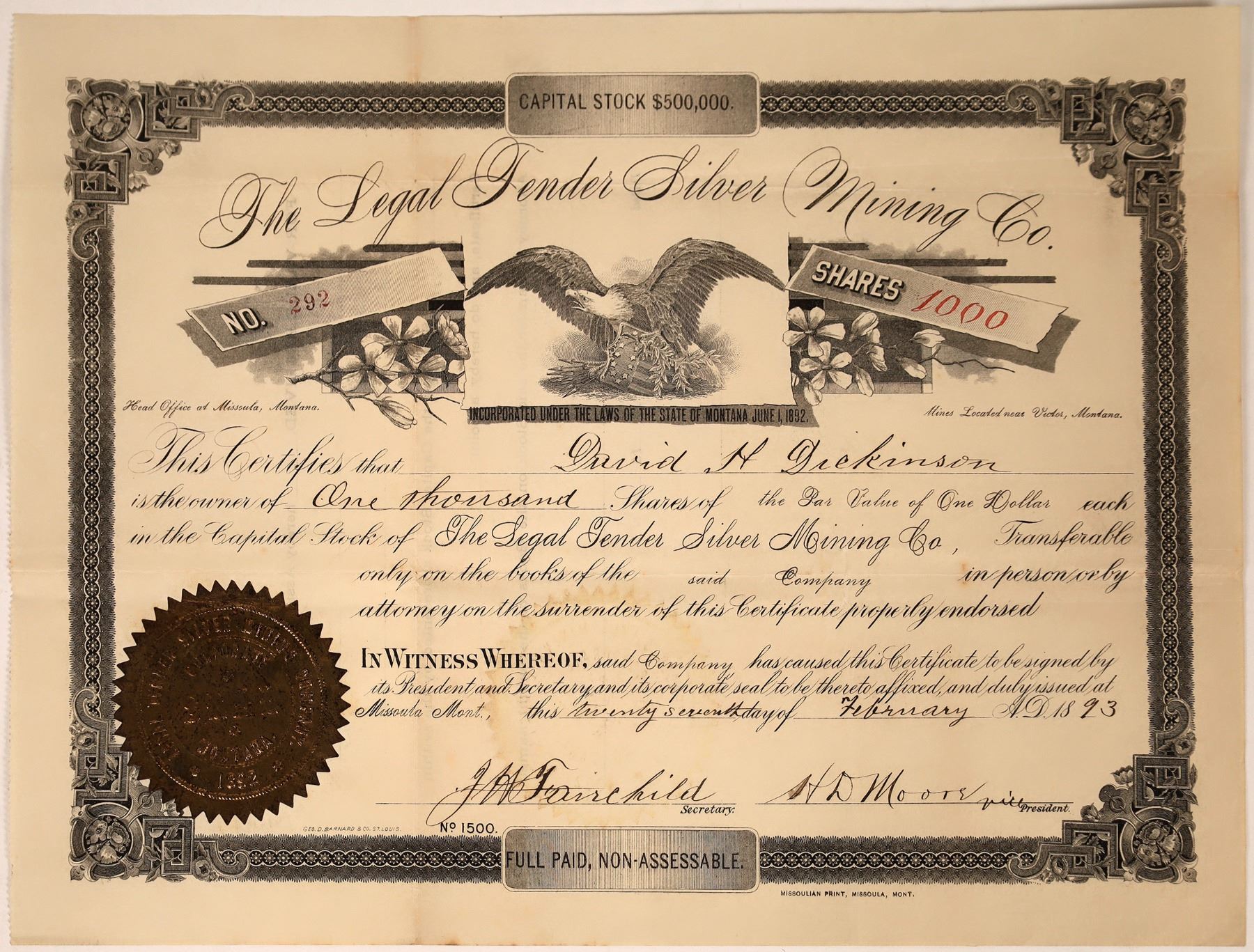 # 292 for 1000 shares to David H Dickinson. Datelined Feb. 27, 1893, Missoula. Signed by vice president HD Moore and JH Fairchild. Unusual design of Missoulian Print. Eagle vignette and fancy title area. Gold seal. Vertical horizontal and vertical folds. One pin hole at fold intersection. Light staining. Overall very nice. Located in the beautiful Bitterroot Valley, Victor is nestled between the Bitterroot Mountain Range, the Bitterroot River, and the Sapphire Mountain Range. Named for Chief Victor of the Salish tribe.