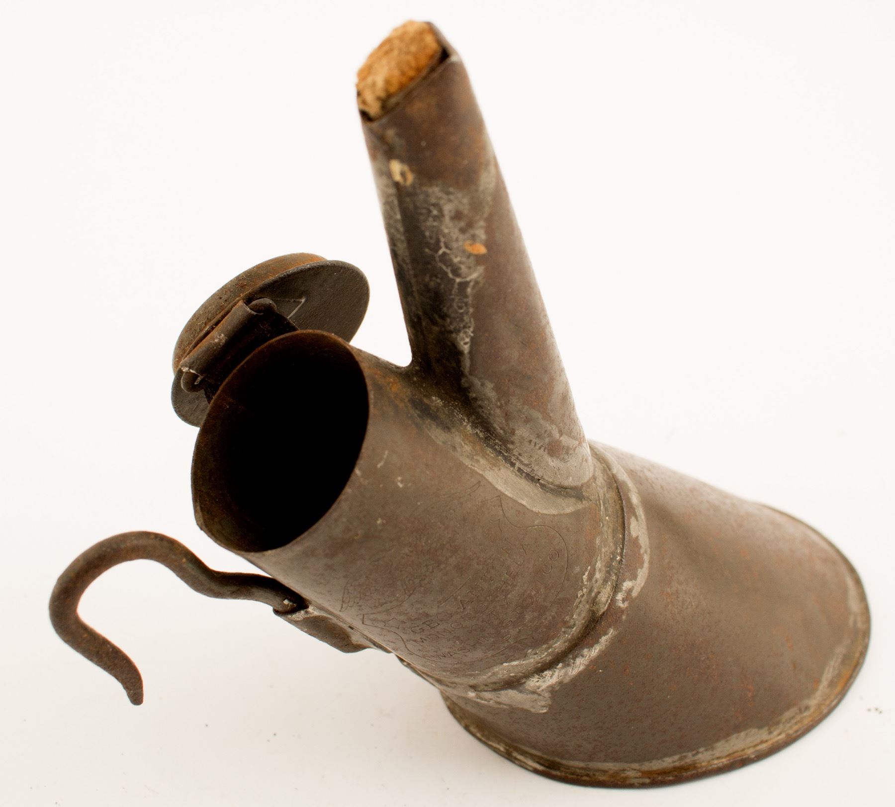 This large oil capacity lamp has an extra fuel hat brace and a few small dings. 4.75 inches tall. The only lamp of this style in this extensive collection. State: City: HWAC#: 48749 Date: