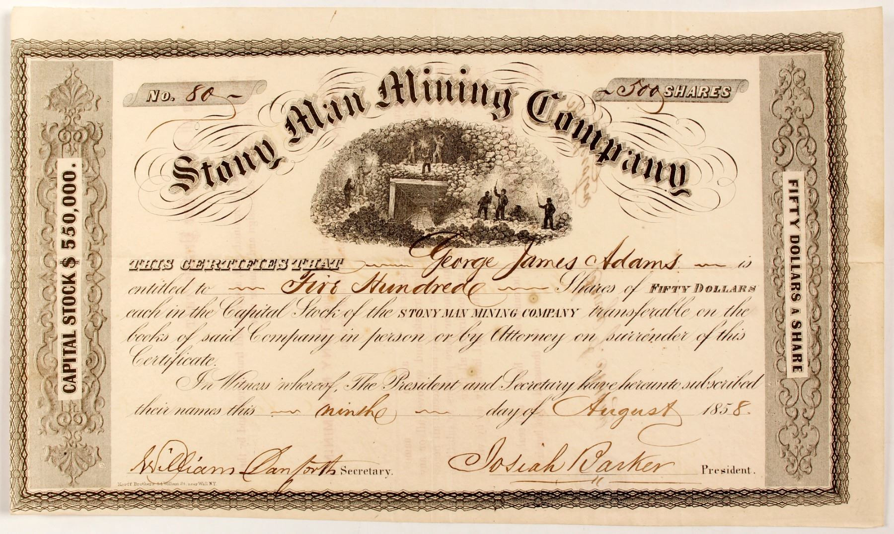 Number 80 for 500 shares to George James Adams on August 9, 1858. Signed by secretary William Danforth and president Josiah Barker. 1859. Unusual underground mining vignette! Vertical and horizontal folds. Kerff Brothers printer. Very nice condition. 6 x 10.25". "In 1854 Samuel and Maria Williams of Brooklyn, New York purchased 21,371 acres of land in the Blue Ridge Mountains of Virginia for $4,750. One year later the land was passed on to the Virginia Cliff Copper Company for $1,000,000, although only $7,000 was ever actually tendered. Soon 5,371 acres of the tract were sold to the newly incorporated (January 1858) Stony Man Mining Company for $550,000 of stockholder funds. In 1866 the Miners Lode Copper Company (incorporated in NYC in 1865) purchased the property." [nps.gov] Today this is all part of the Shenandoah National Park and Skyland. State: Virginia City: Shenandoah Date: 1858 HWAC# 81909