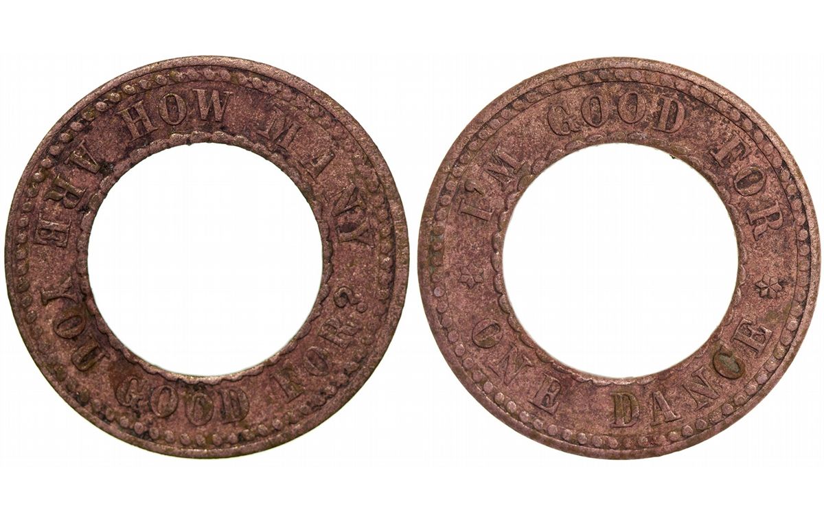 Very rare. Hollands. This was a bi-metallic token. Center missing. Front: "How many are you good for?" Reverse: "I'm good for one dance." Ex-Adele Reed token. At the time she found it, it was the only one known.City: BishopCounty: InyoState: CADate: