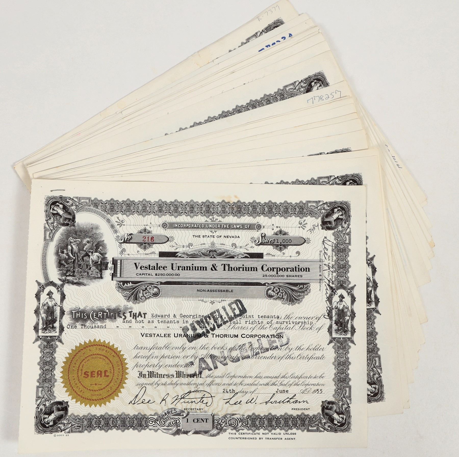 Group of approx. 25 stock certificates from the Vestalee Uranium & Thorium Corporation of Elko, Nevada, issued 1954 to 1955. All issued & cancelled. Black w/ gold underprint, some great mining vignettes. 10.75"x8.5" certs, generally good condition; see photos.