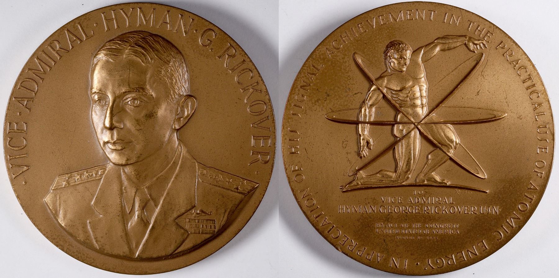 Obv.: Vice Admiral Hyman G. Rickover / portrait; Rev.: In Appreciation of his signal achievement in the practical use of atomic energy / (figure with atoms circling) / To / Vice Admiral / Hyman George Rickover U.S.N. / By Act of the Congress / United States of America / August 19, 1958. Bronze, 76 mm. Rickover was in the military 60 years and served 13 presidents. Frank Gasparro was lead designer for the U.S. Mint for many years.