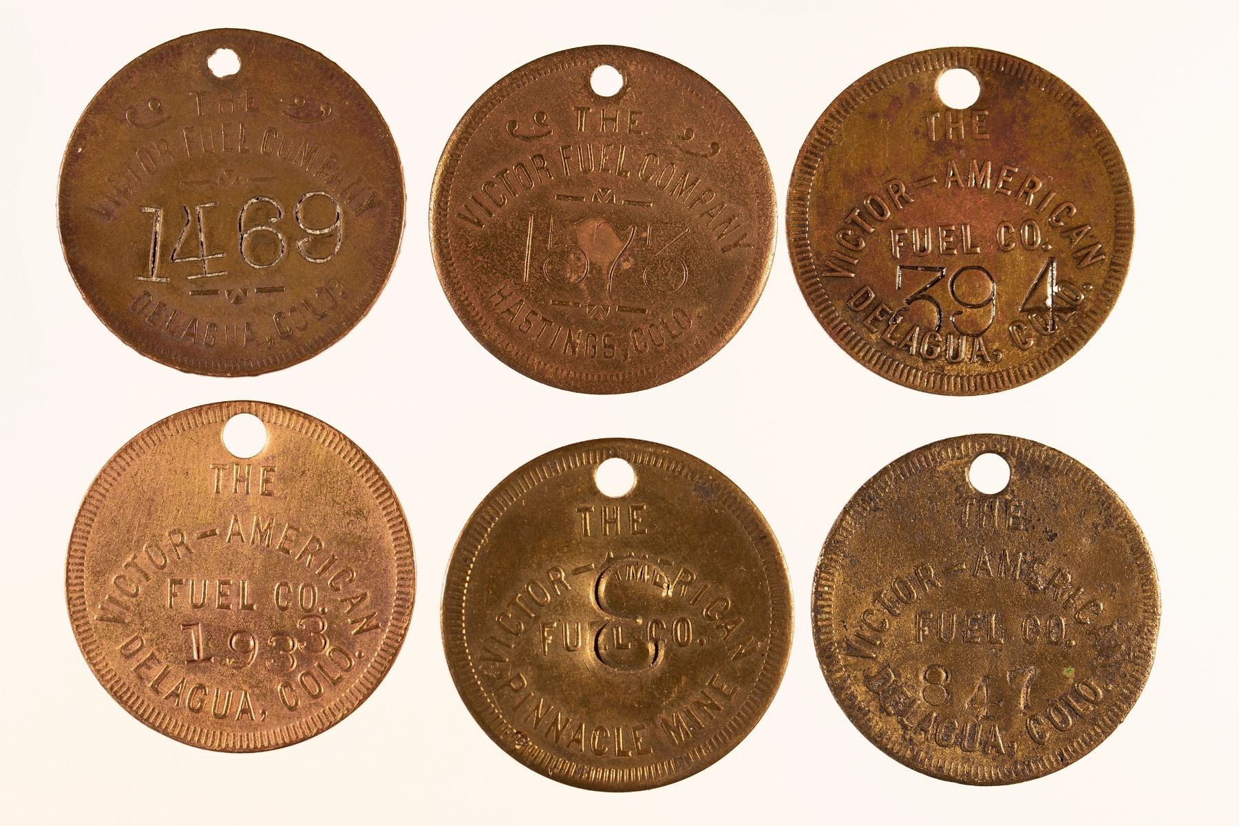 6 round Victor American Fuel metal tags. Hastings, Pinnacle, 4 Delague. 1.25".