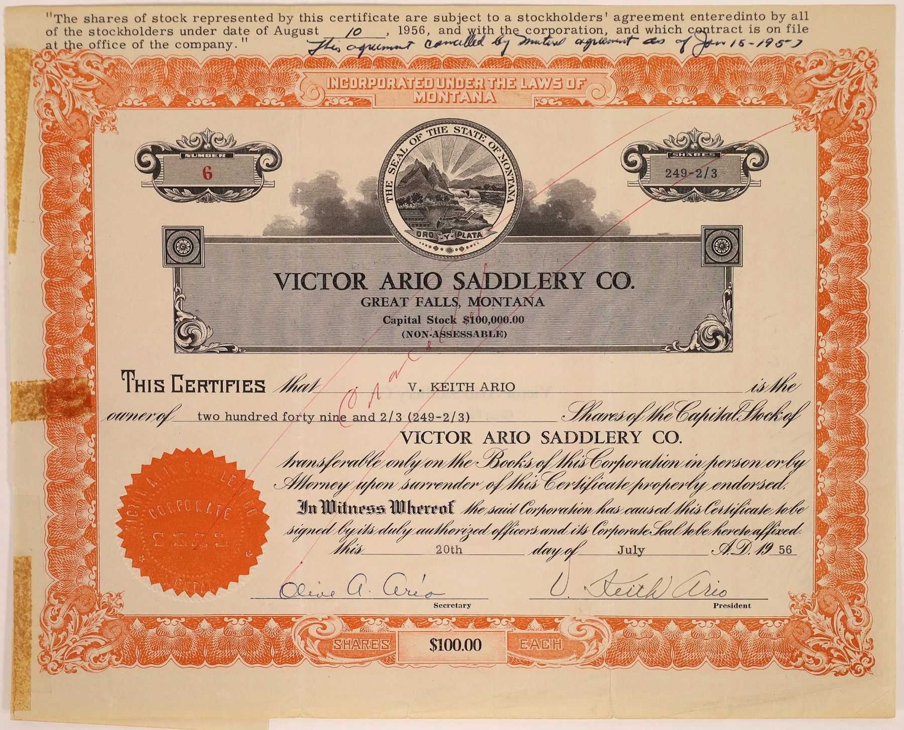 Inc. in Montana. Low number 6, issued for 249 2/3 shares to president V. Keith Ario in 1956. Signed by president Ario and secretary Olive Ario. Pen cancelled. Orange border and seal, black print, and vignette of Montana state seal. Stub attached with old tape (causing tape stains). Folds with a few tears. Victor Ario started the business in 1897. He died in 1959. Famous Western saddlery.