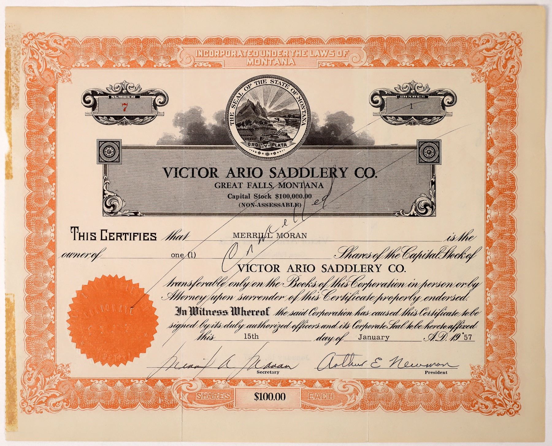 Issued Victor Ario Saddlery stock, 1957. Part of Stuart Mackenzie private collection. 1" and .5" lower crease tears.