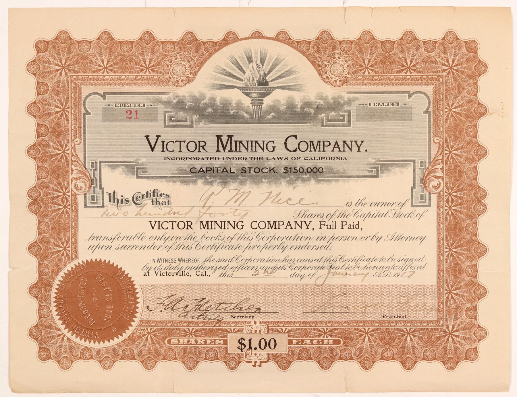 Inc. in California. No. 21, issued for 240 shares to RM Nice on Jan. 2nd, 1917 in Victorville, California. Signed by president Frank Phillips and secretary Fletcher. Not cancelled. Brown border and seal, vignette of torch. Deep folds with some separations, tears along edges. Please inspect. 8.25 x 11" Victorville is located in southwestern San Bernardino County. Ken Prag Collection