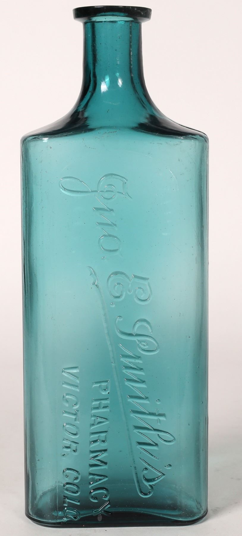 John E. Smith's/Pharmacy/Victor, Colo., 32 ounces, 10 1/2" tall in teal, a stunningly beautiful bottle. Repaired lip chip barely visible except under proper lighting. Ron Reed Collection. Reed specialized in the big, giant 32 ounce Colorado drugstore bottles, and every Colorado collector knows Ron had this beauty, one of the prizes of his collection, and a true prize for any American colored drugstore bottle collector.
