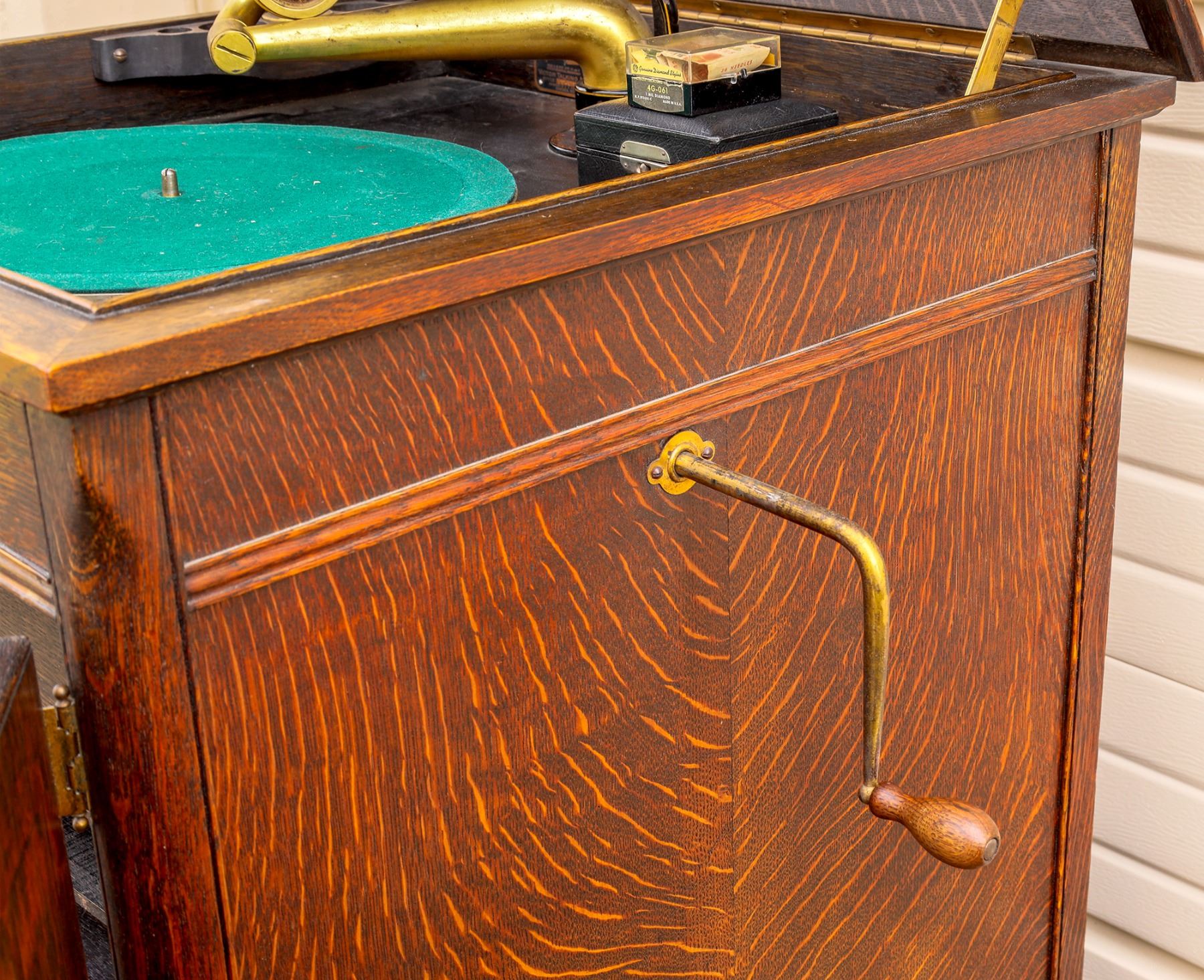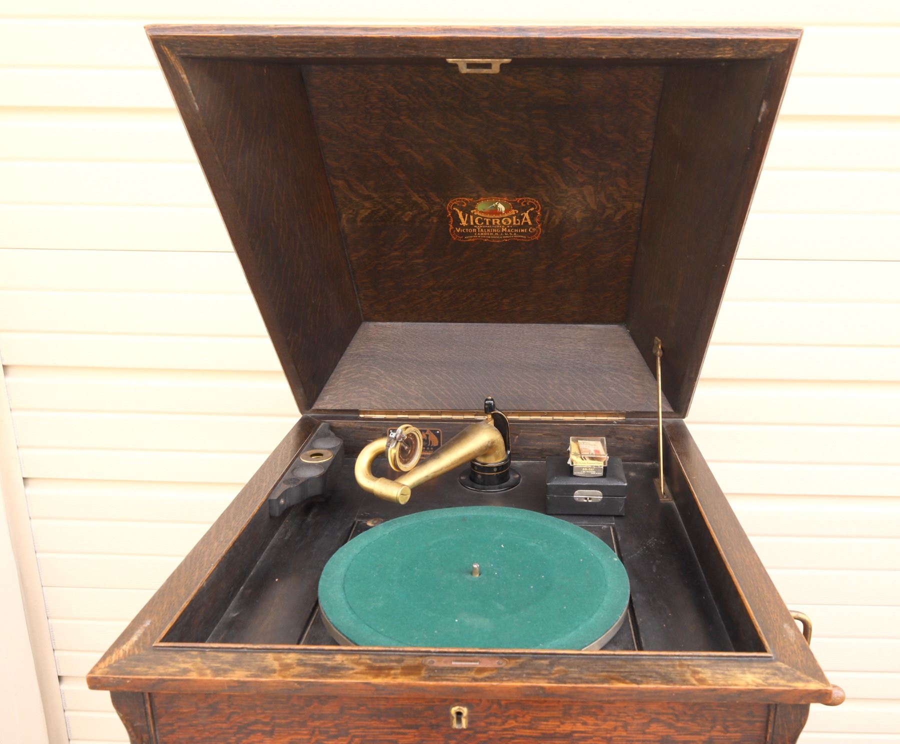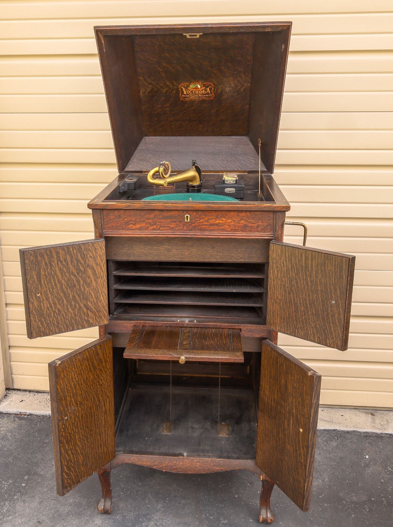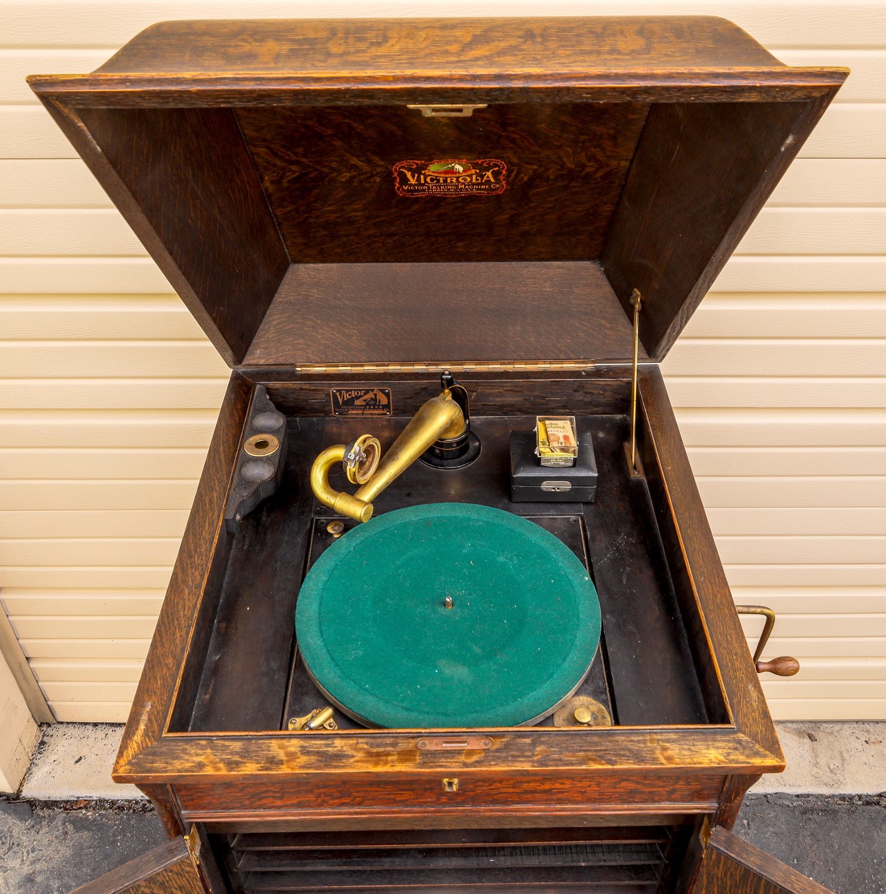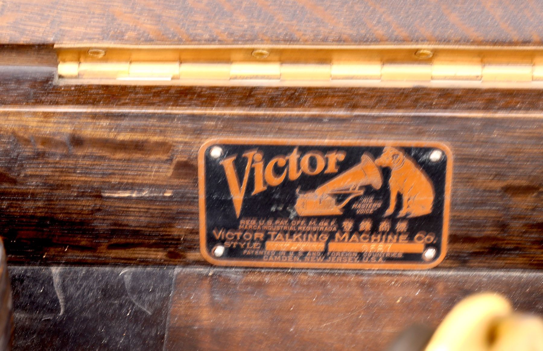 This is an early model Victor "Talking Machine" serial #9587, with hand crank and the original label under the lid. The cabinet measures 46"x 24"x 22". It has a hinged flap on the back (Possibly t6o allow access to the workings), Missing top left cabinet knob. This comes with an internal speaker. It is one of the earliest models and is very rare. Camden New Jersey