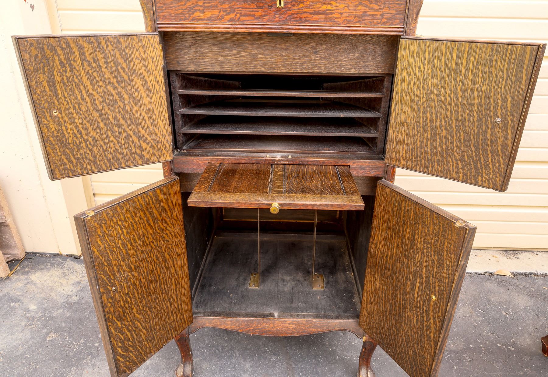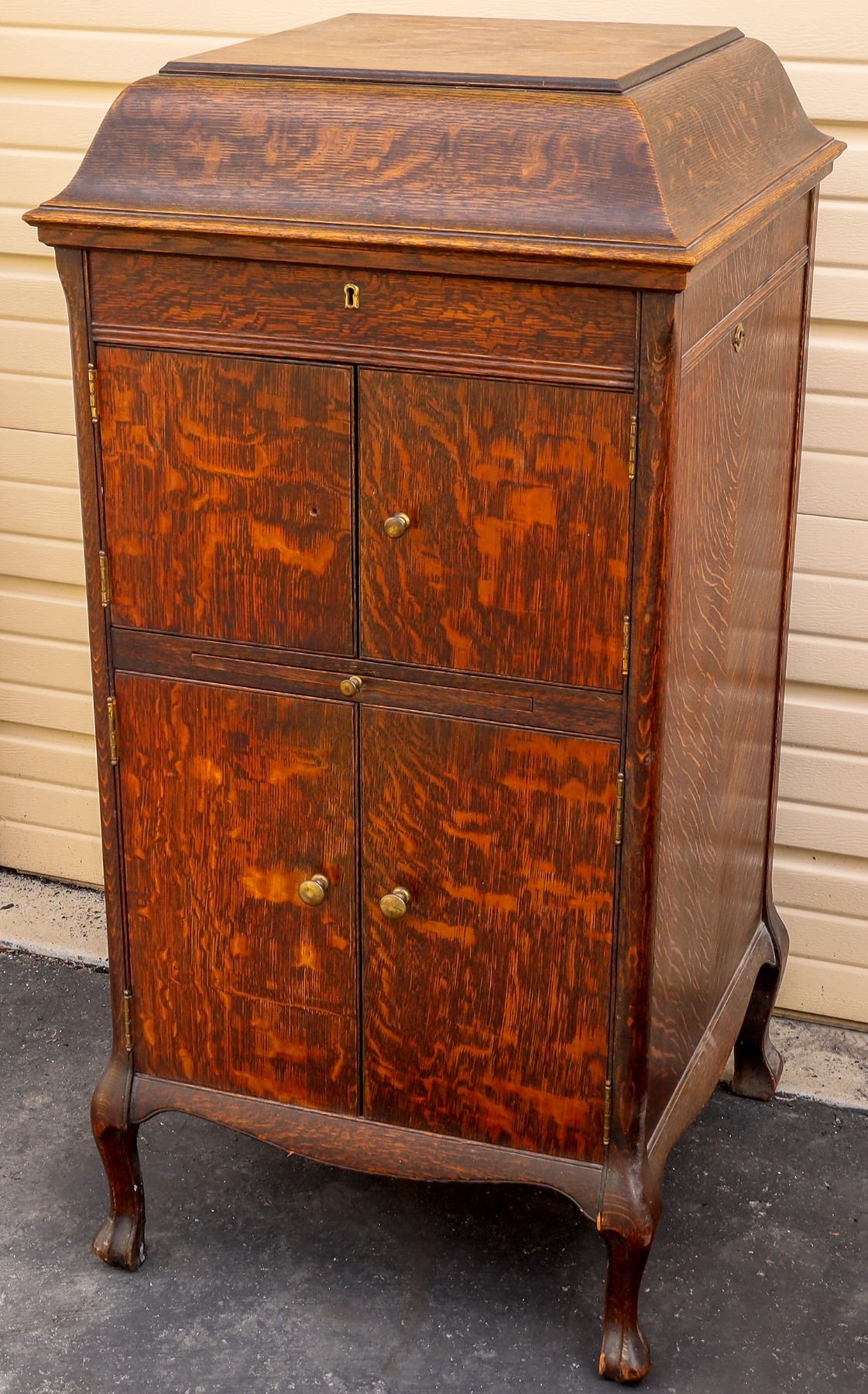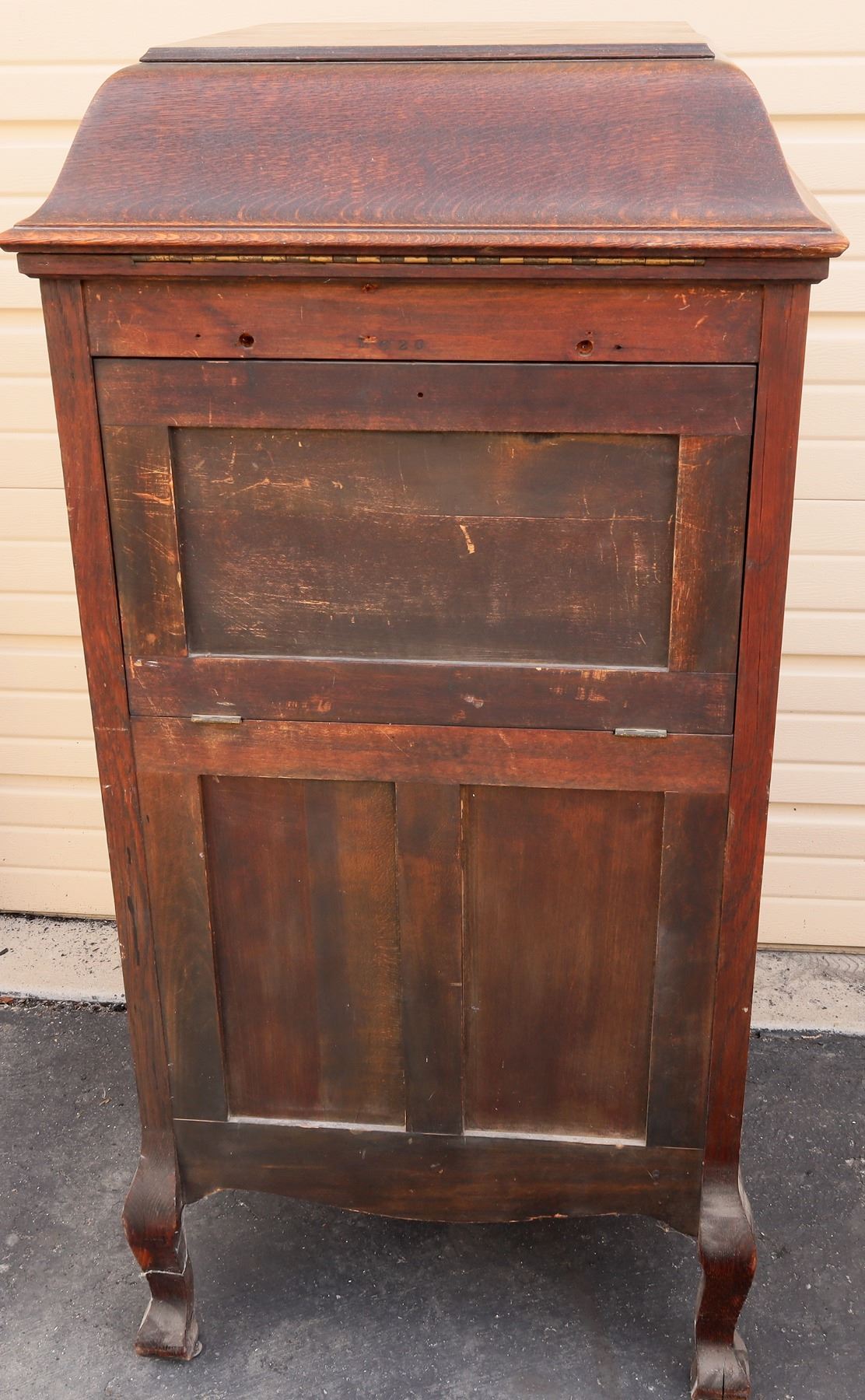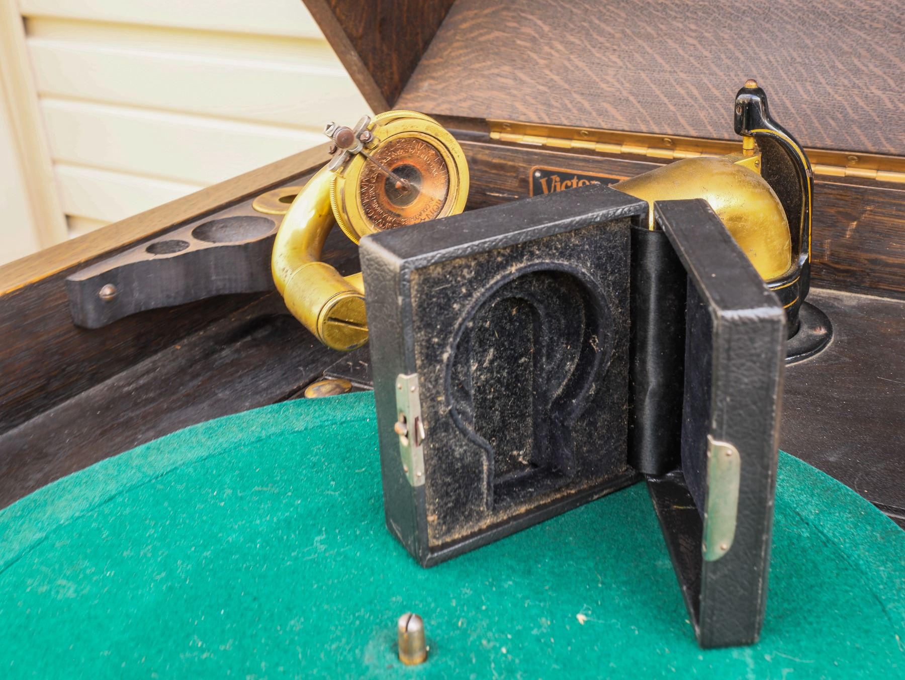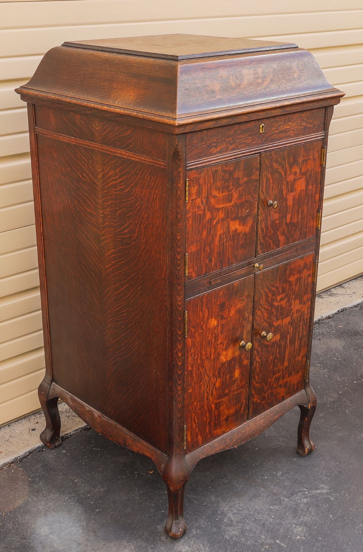 This is an early model Victor "Talking Machine" serial #9587, with hand crank and the original label under the lid. The cabinet measures 46"x 24"x 22". It has a hinged flap on the back (Possibly t6o allow access to the workings), Missing top left cabinet knob. This comes with an internal speaker. It is one of the earliest models and is very rare. Camden New Jersey