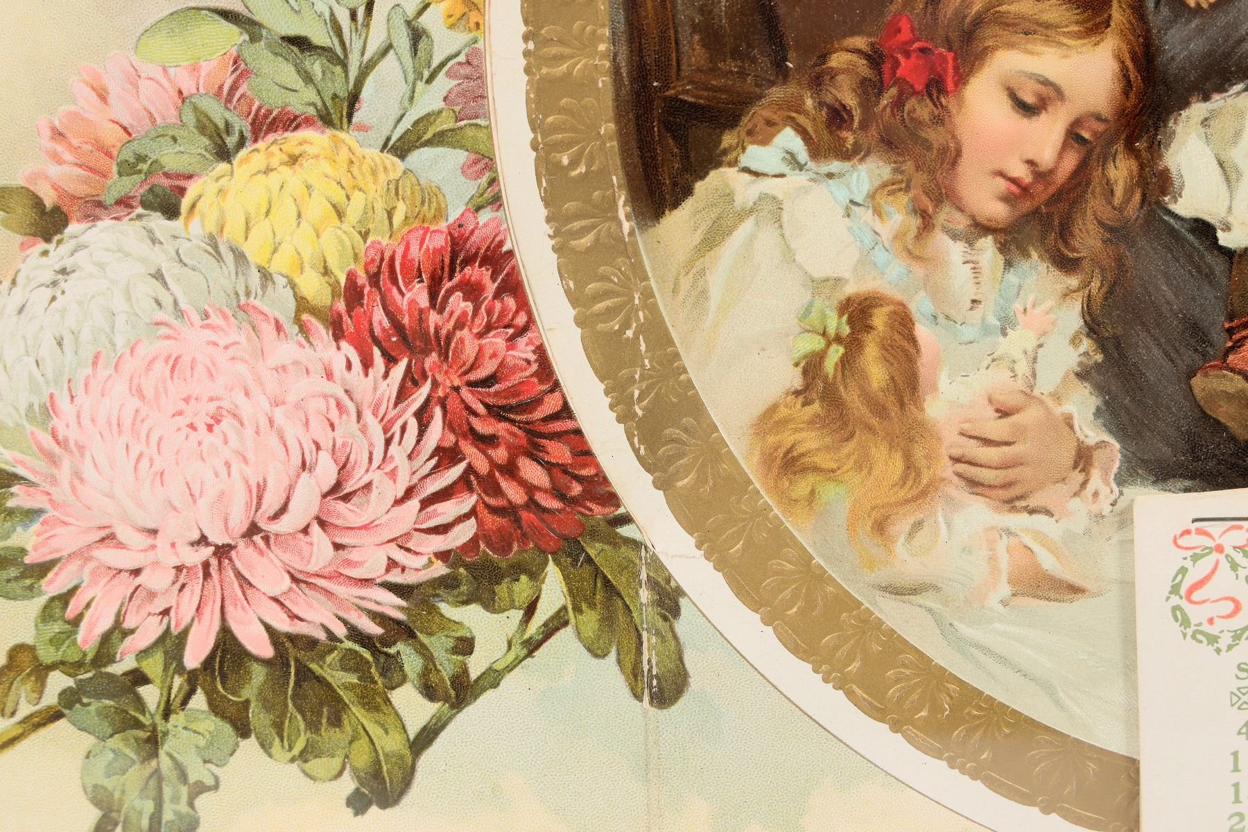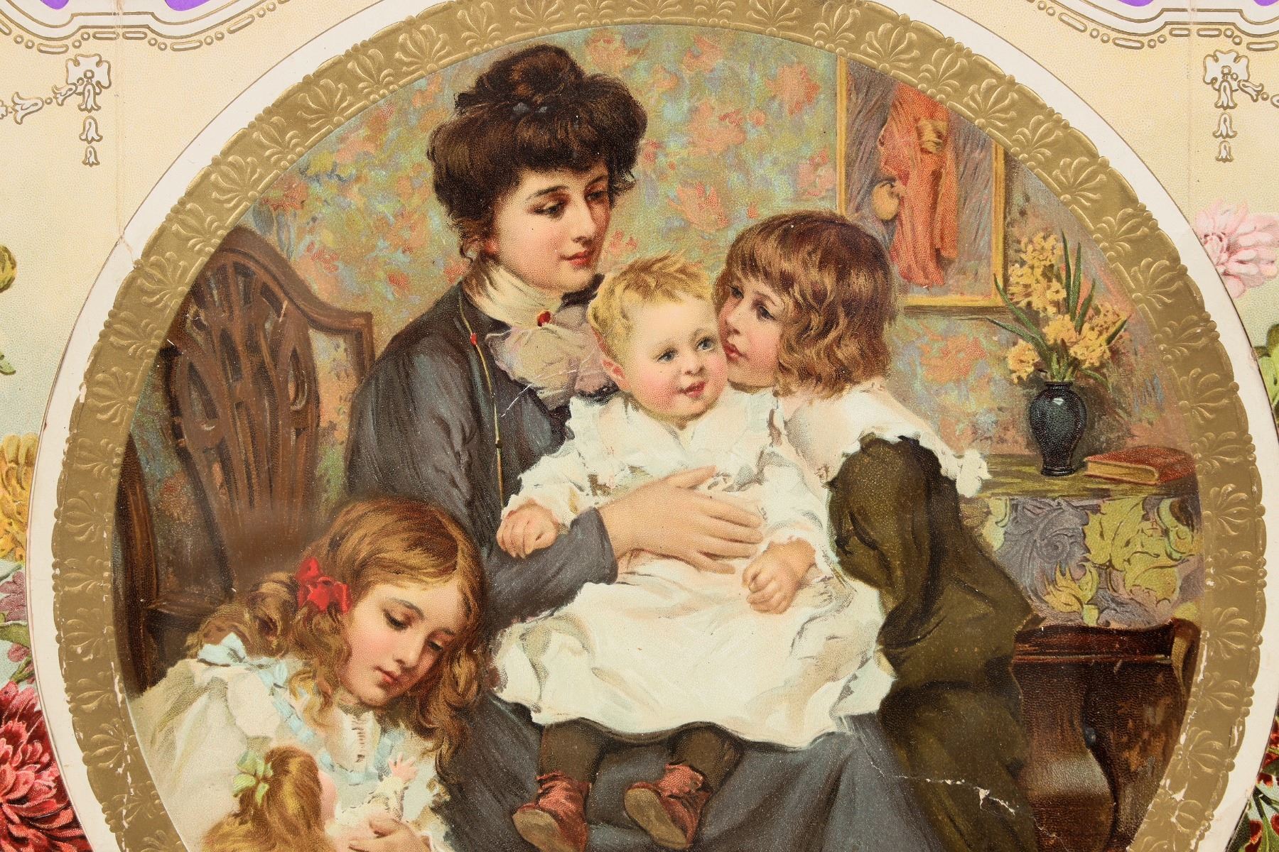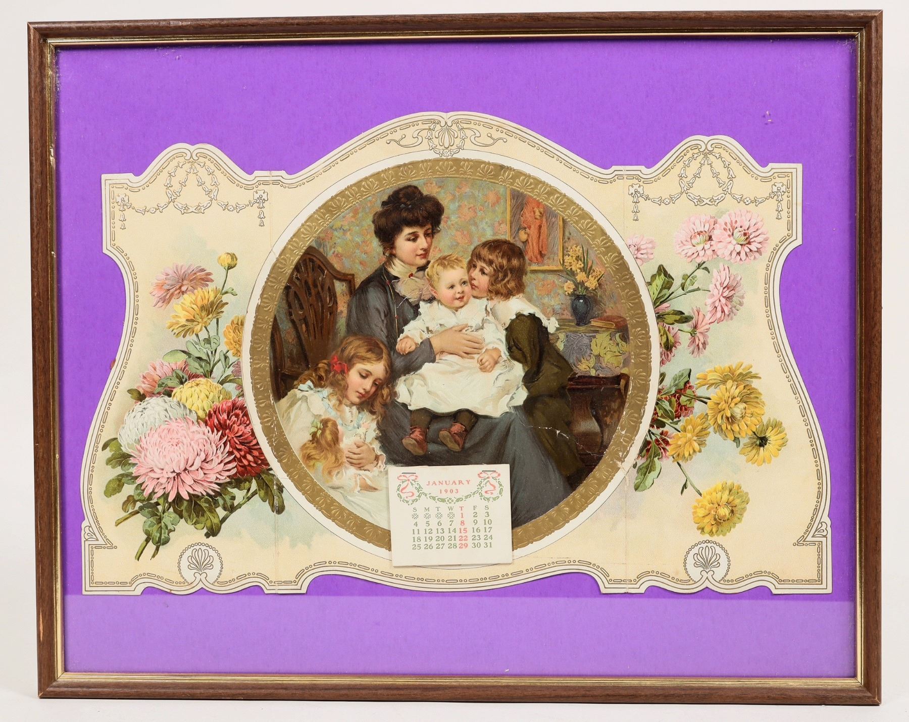 Framed 21 x 17 inch 1903 Calendar. Woman holds her baby while her two other daughters look on. Victorian charm.