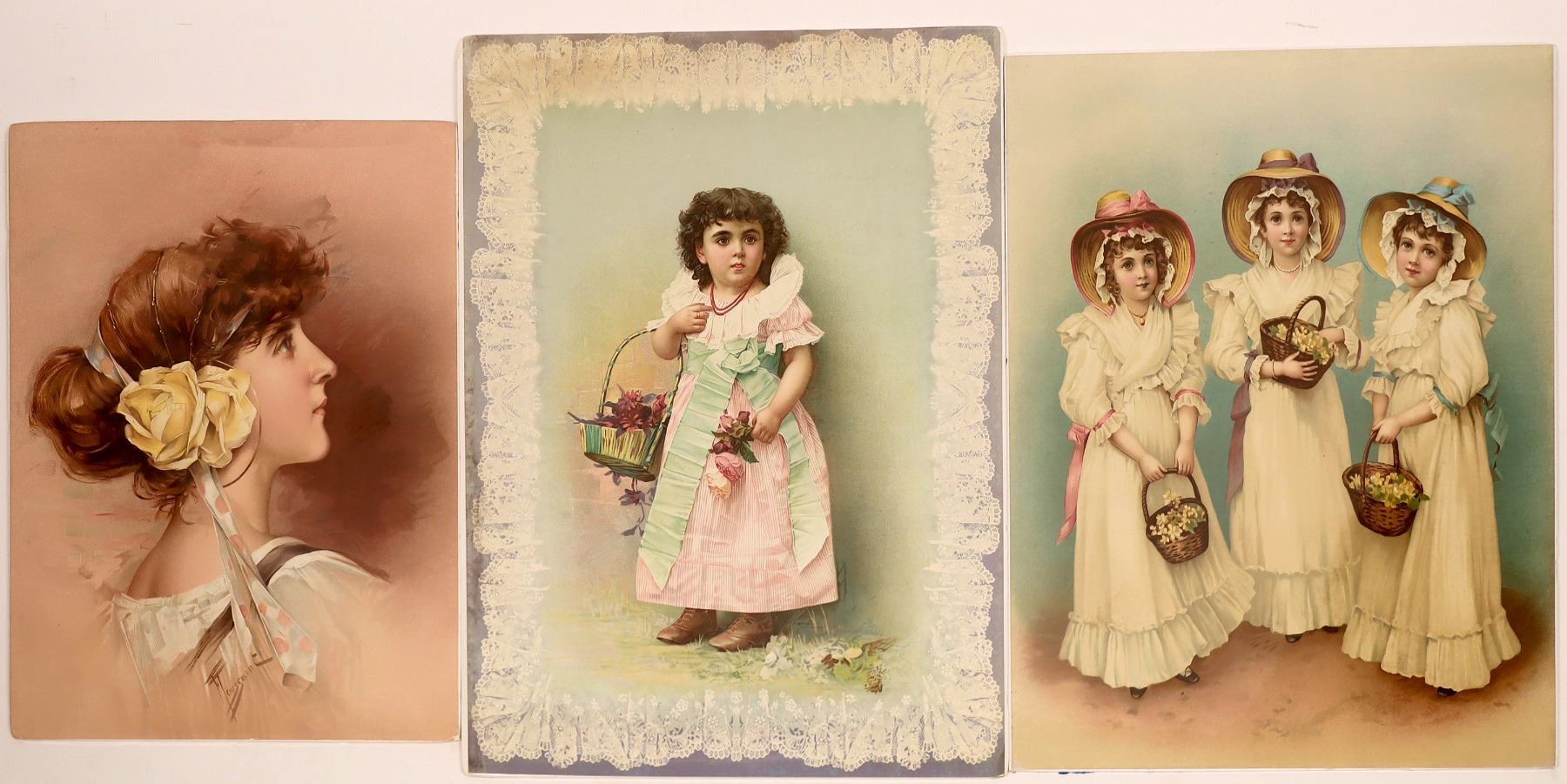 These are three Victorian art prints. The woman with the yellow rose was painted originally by Frederich Tousaint of Belgium here in lithograph. All prints are is good condition ready for framing. The yellow rose print is 12.5 x 17 inches, the others are 15 x 20 inches.