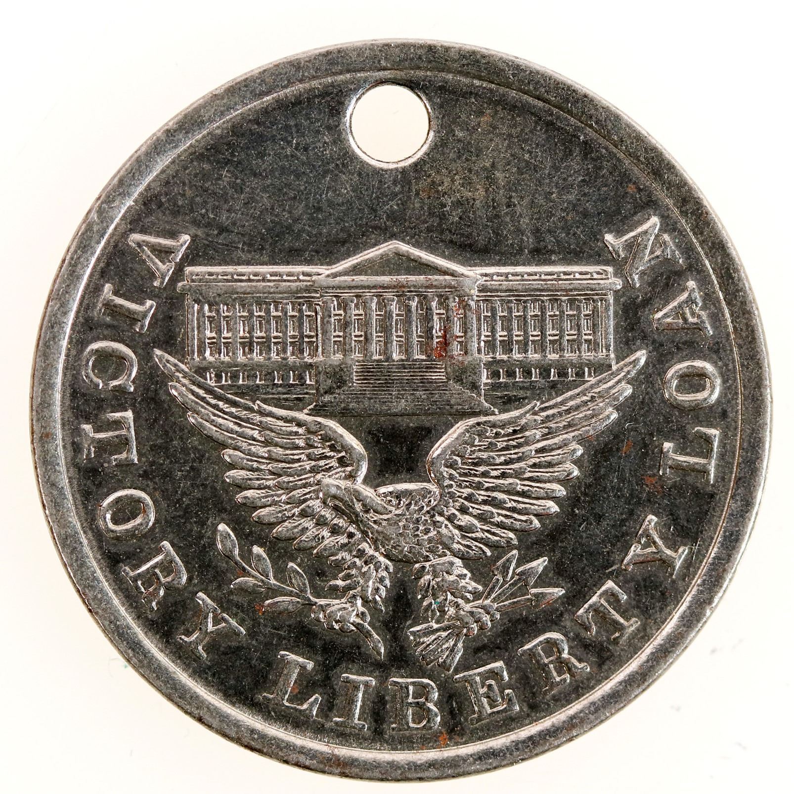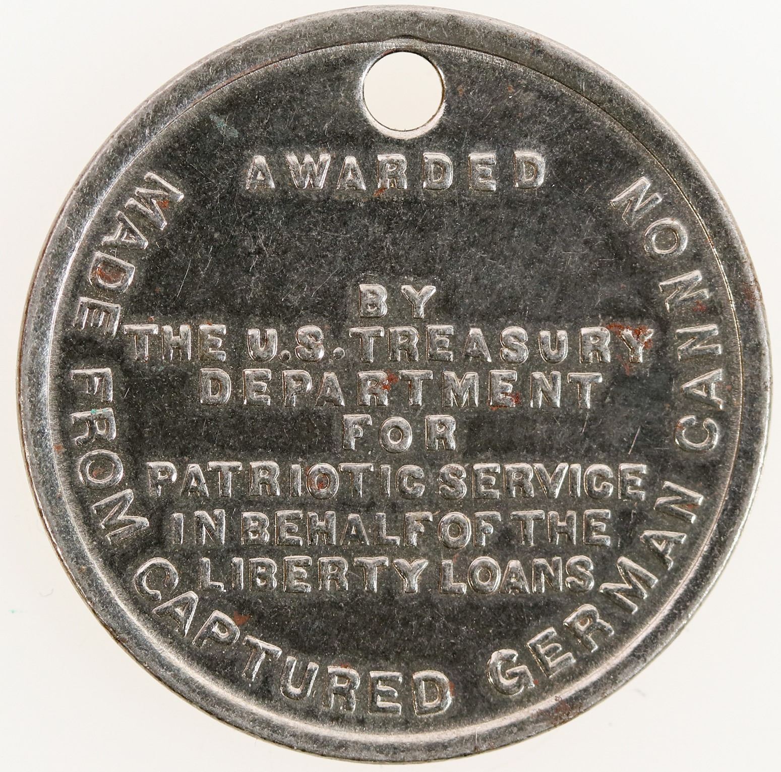Usually dug or in poor condition, this specimen is in almost uncirculated condition. Obv.: Victory Liberty Loan; Rev.: Awarded / By / The U. S. Treasury / Department / For / Patriotic Service / In Behalf Of The / Liberty Loans/ Made From Captured German Cannon; Wm, rd., 30 mm, holed.