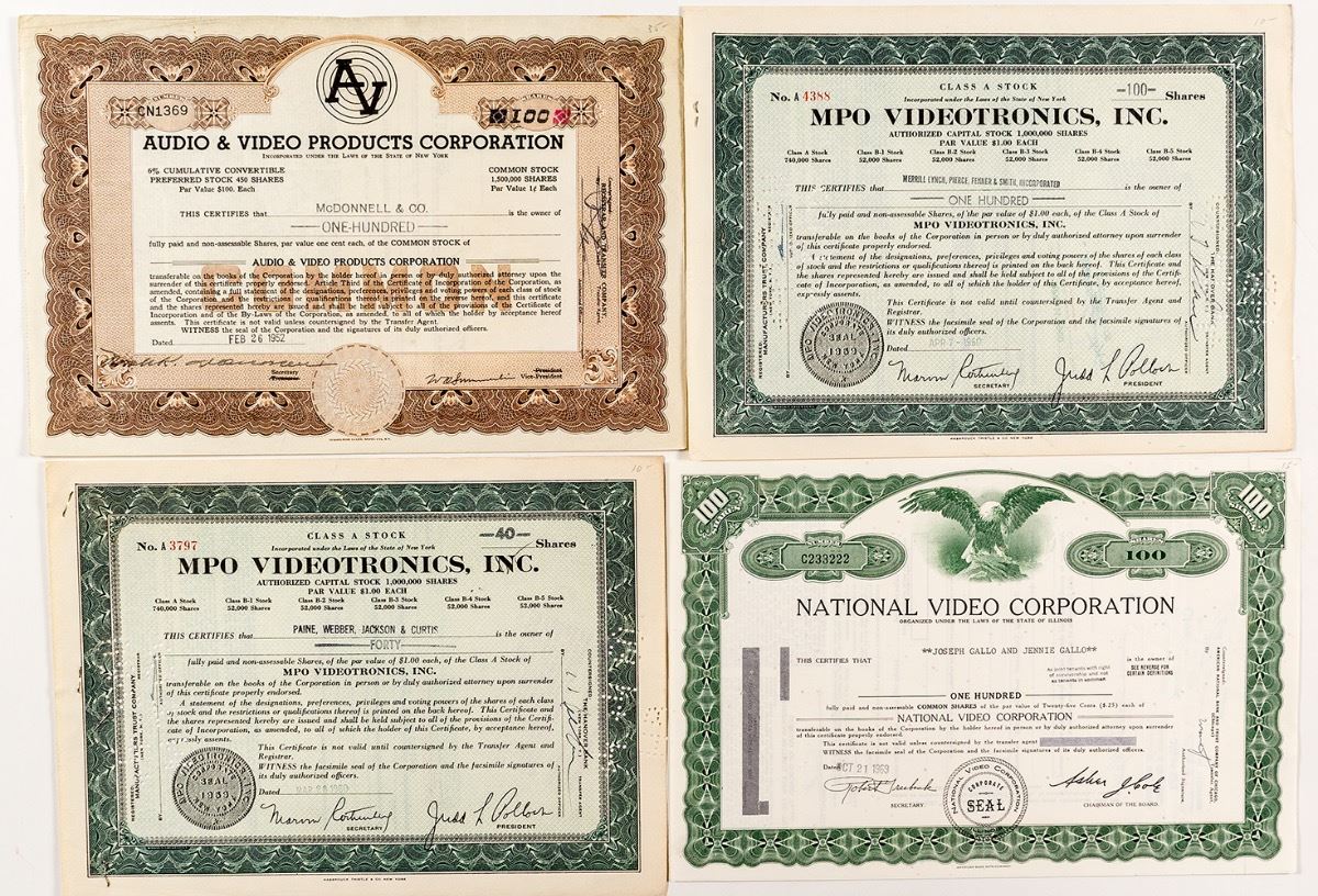 Lot of four certificates from companies with "video" in their name. Includes: MPO Videotronics (two issued and cancelled in 1960), Audio & Video Products Corp. (issued in 1952, not cancelled), and National Video Corp. (issued in 1969, not cancelled). (Prag Collection) City: State: Date: 1952-1969 ID# 31375