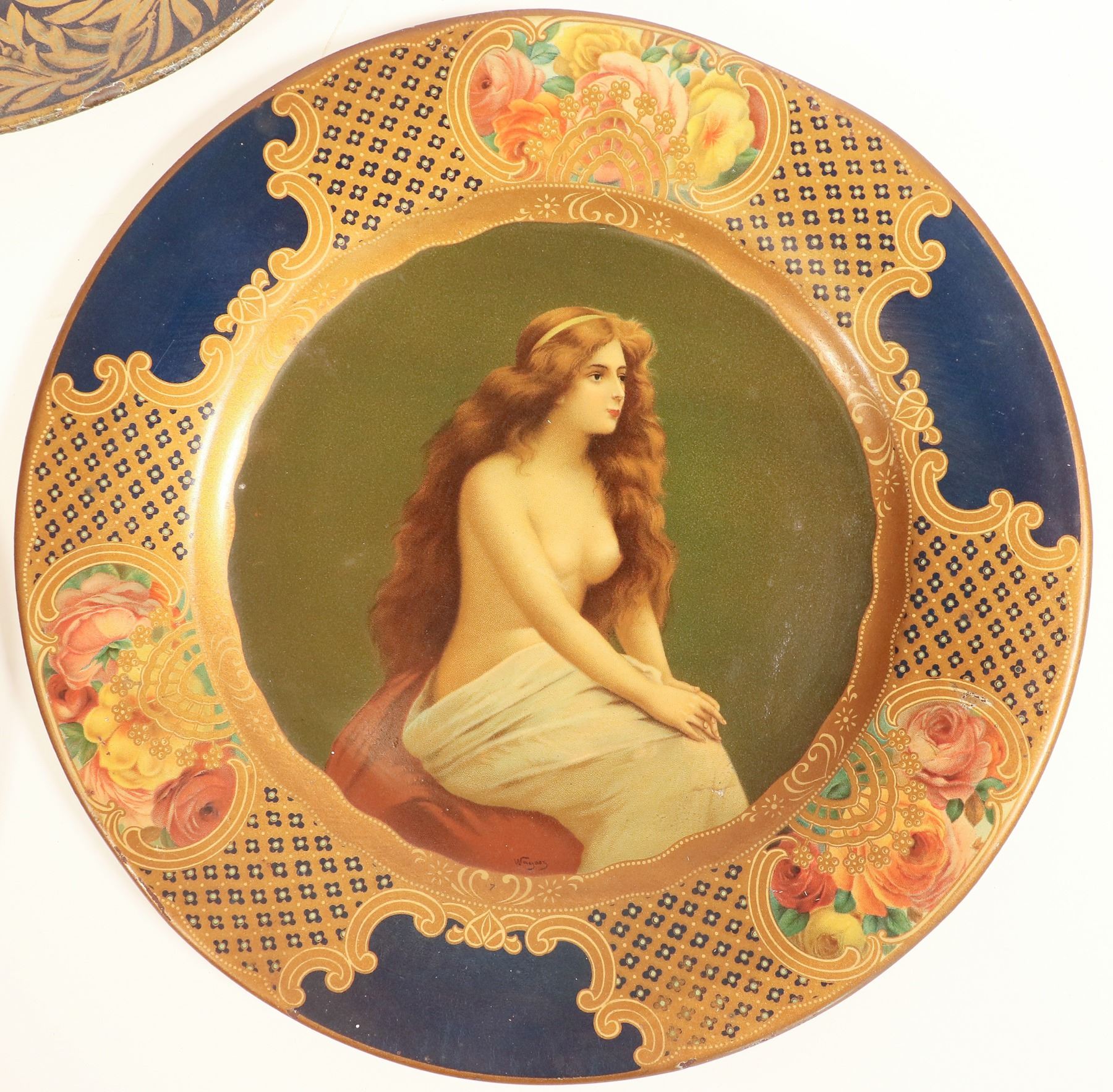 This are three round beer trays with three lovely ladies at 10 in. across. One glowing young lady, with surface wear patent date Feb. 21, 1905; one with flowing brown hair, surface wear; and one barely clothed woman with flowing brown hair in very good condition, curled edge patent date Feb. 21, 1905. C. 1910. c. 1905-1910