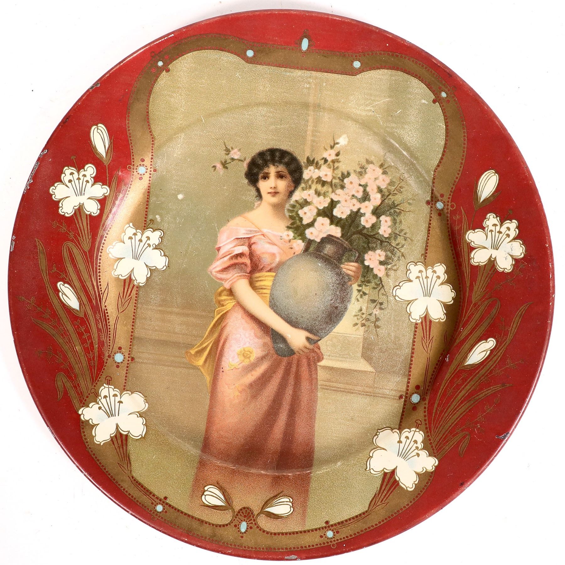 This is a Vienna Art Plate with a patent date of Feb. 21st, 1903. It depicts a woman with a large flower vase at 10 in. Pre-Pro. In good condition with a flower border. c 1903