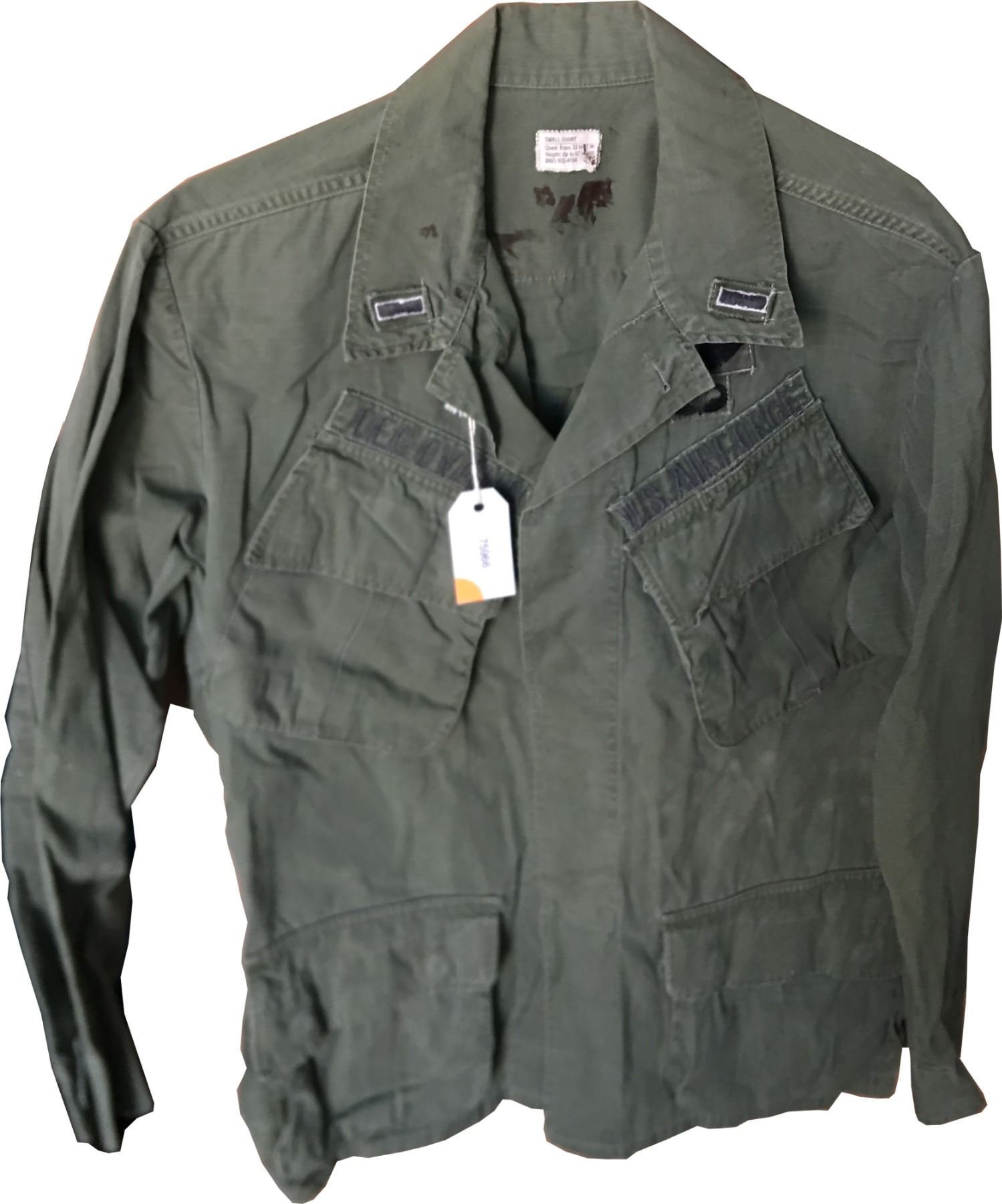 Very nice Vietnam War Air Force Officer’s combat uniform jacket. All of the patches appear to be made in Vietnam which is rare. Many of these combat uniforms didn’t survive, and although damaged, this is a nice example, because it was worn by one who was also Airborne qualified! State: City: Date: