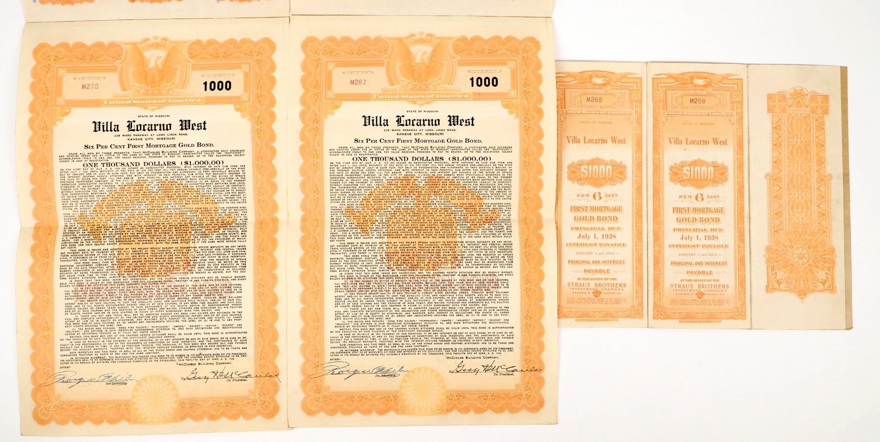 Lot of (4). $1000 Construction Bonds, listed as Six Per Cent First Mortgage Gold Bonds. Bound attached $30 Coupons, about half redeemed. Coupons list the McCanies Building Company will pay the Bearer. Half-fold sheets, measure 14.75"x9.5" extended. Overall condition is good to very good, showing age wear. Please see photos.