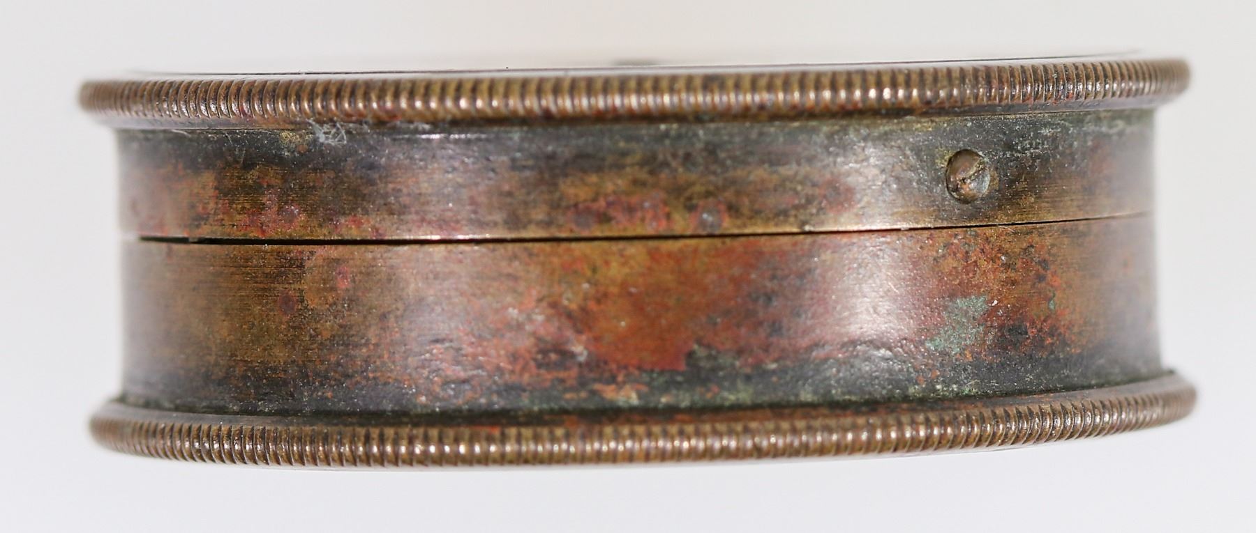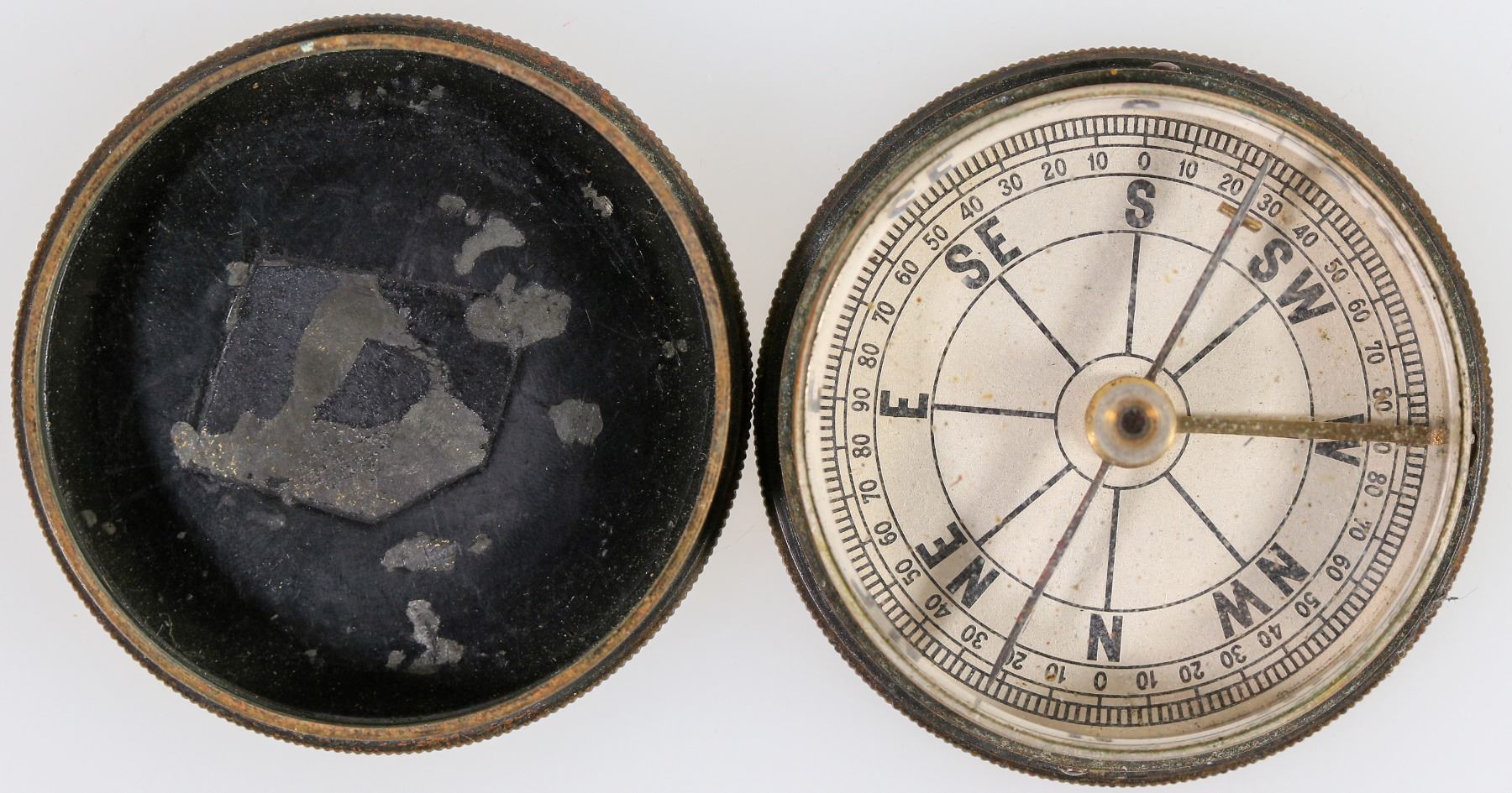 This little compass was made in the 1910's without a name of maker and still works today. At 1.5 in. in diameter. Clear lens and bright card. The needle stop is frozen open. Please see photo for details.