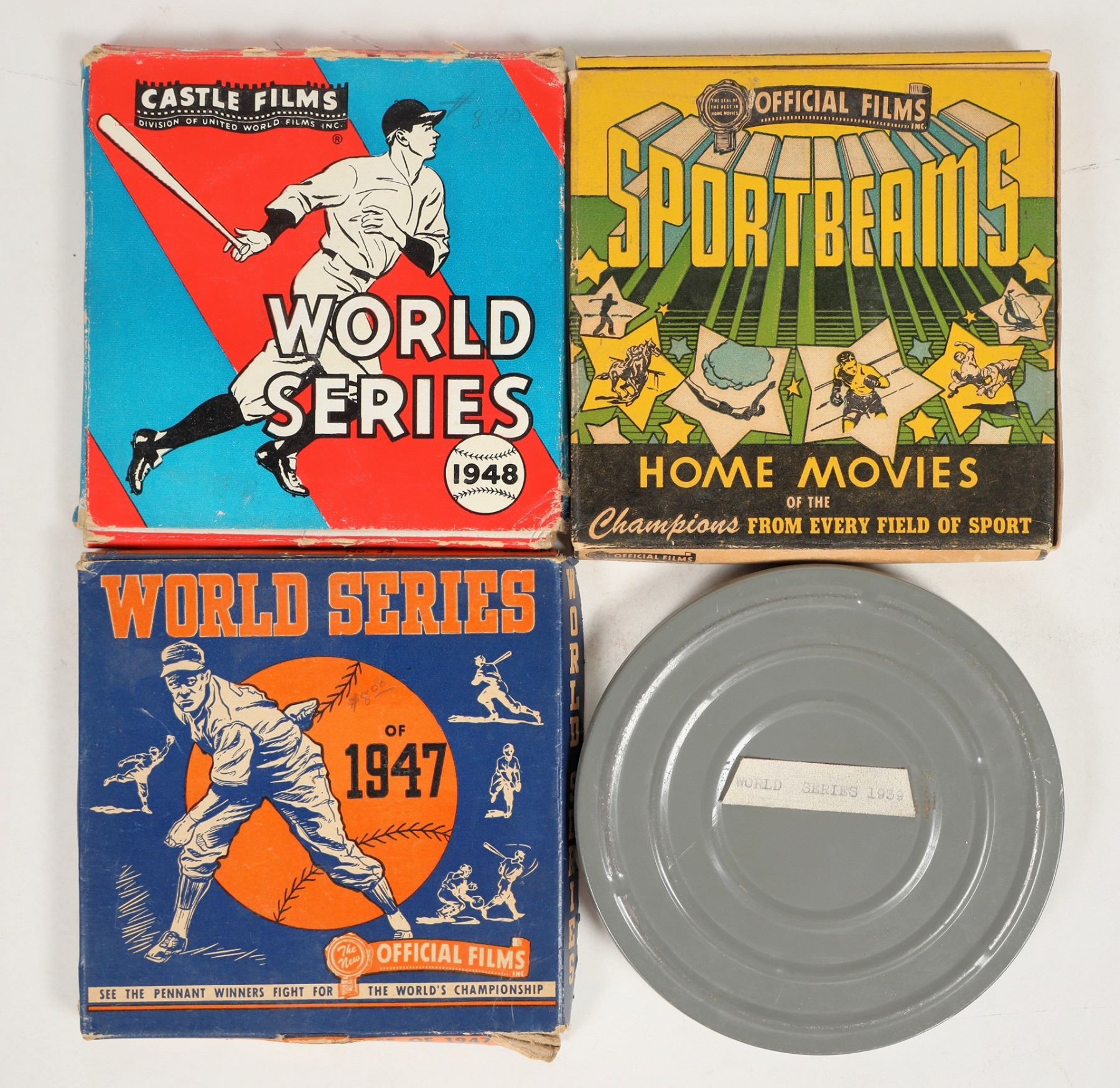 Lot of 4. Three Films of the baseball World Series : 1939, 47&48. , the third is by Castle Films. One film is in a plain movie tin. A fourth movie is "Big League Baseball" , coverage of champions. All appear in good condition. Three are in original boxes.