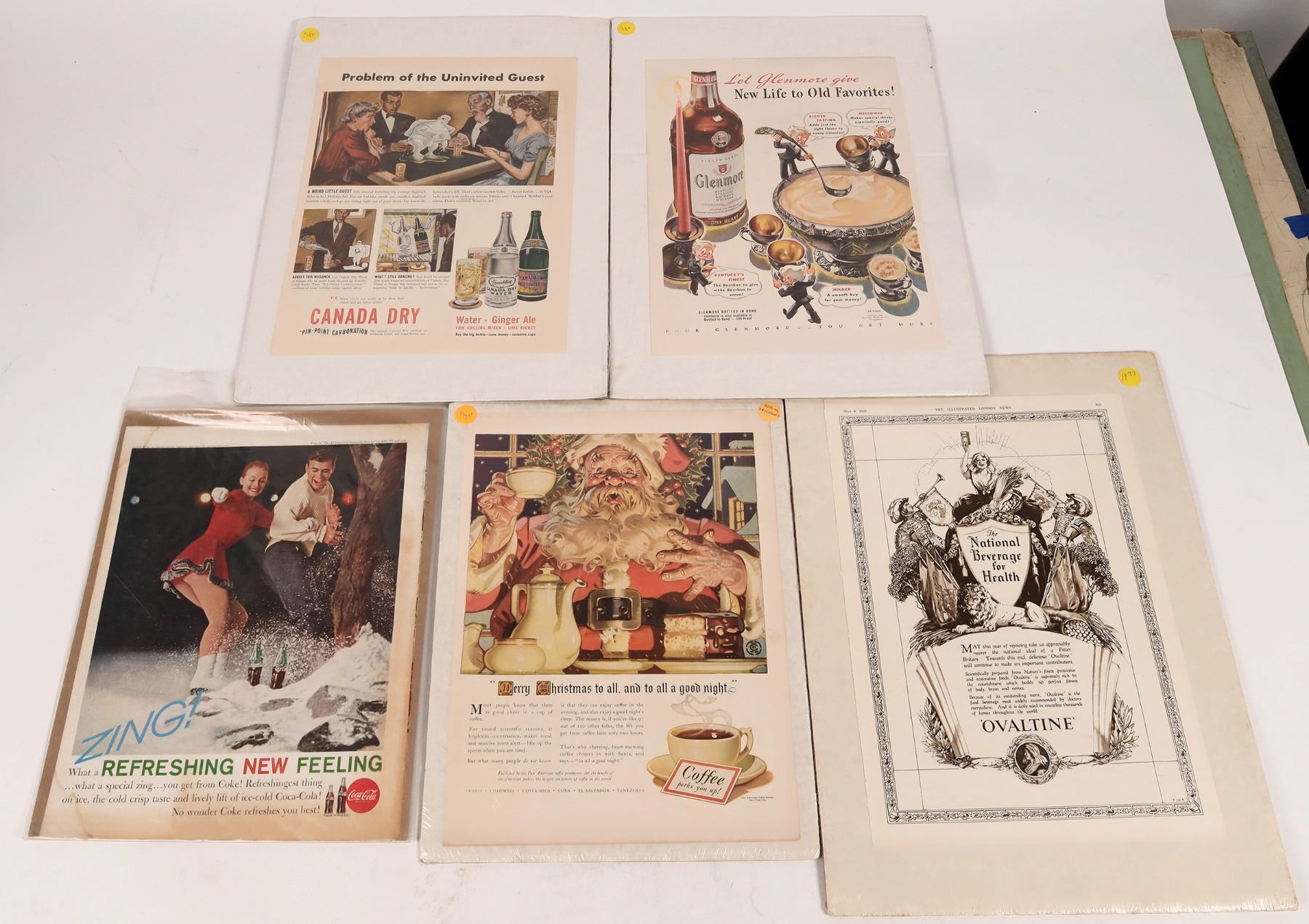 Lot of six vintage advertising posters, 10 x 14 inches or smaller. Old Glenmore bourbon; Coca Cola ice skaters; Ovaltine "The National Beverage for Health" (1937 Illustrated London News); Santa Claus enjoying coffee, Pan American Coffee Bureau 1940s Joseph Christian Leyendecker original; Canada Dry Ginger Ale.