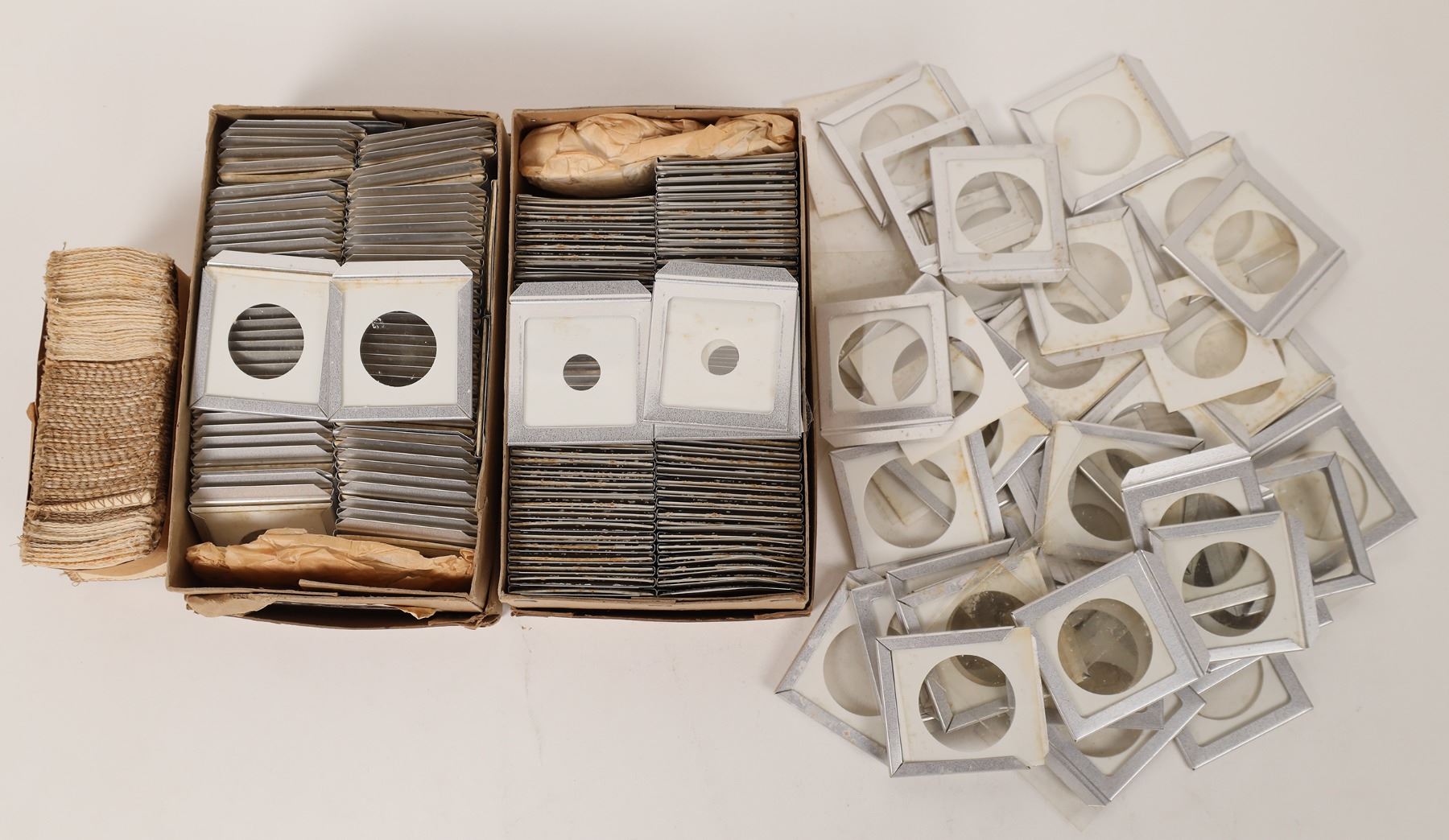 Two and a half boxes, (over 120) aluminum framed 2 x 2s to hold different size coins. Each with cardboard insert and plastic sides. Also about 50 cloth 2 x 2s. Probable 1940s vintage.
