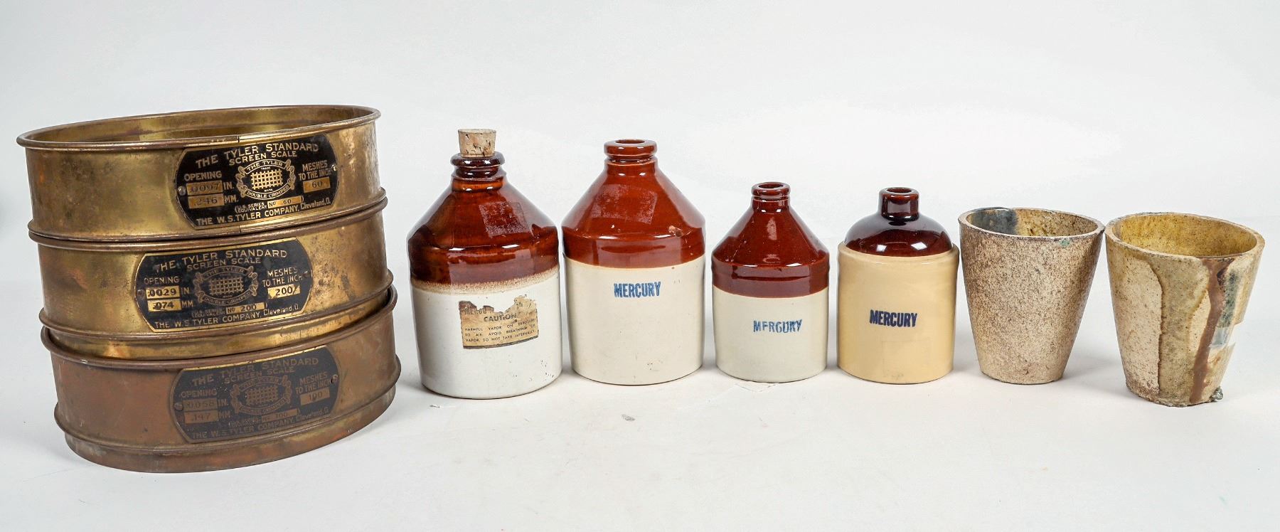 Lot of 9. 1. Three "The Tyler Standard Screen Scale". The W.S Tyler Co. Three mesh sizes : 60,100,200 mesh to the inch. Brass, in good to very good cond. 2. Four stoneware apothecary crock jar two sizes : 4.5 and 6 " tall. Excellent cond. . 3. Two mining crucibles. 4" tall, 6oz. in very good cond. Unsure as to material: clay, graphite or clay-graphite..