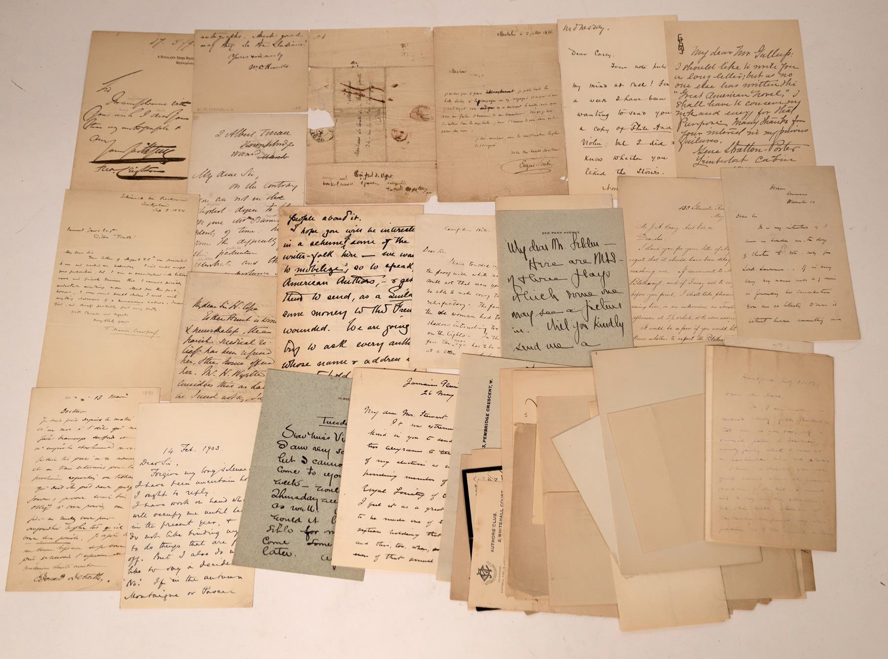 About 30 mostly British 19th to early 20th century autographed letters. RD Blackmore-English novelist. Bliss Carman-poet. Upton Sinclair-"American writer, muckraker, political activist and the 1934 Democratic Party nominee for Governor of California who wrote nearly 100 books and other works in several genres. Sinclair's work was well known and popular in the first half of the 20th century, and he won the Pulitzer Prize for Fiction in 1943." from wikipedia. Gertrude Atherton-American author. ? Jasper Vance. Owen Wister-"Owen Wister was an American writer and historian, considered the "father" of western fiction. He is best remembered for writing The Virginian and a biography of Ulysses S. Grant." from wikipedia. Eugene Scribe-French dramatist and librettist (1791-1861). Robert W Chambers-American artist, novelist, short story writer (1865-1933). Elbert Hubbard letter without signature-American writer, publisher, artist, and philosopher. William Tyler Page (1868 ñ October 19, 1942) worked in the United States Capitol in Washington, D.C. for 61 years, first as a page boy and later as a clerk of the United States House of Representatives. He was the author of American Creed and Story of Nation's Capital-signed letter and The American's Creed. W Holman Hunt-English painter and one of the founders of the Pre-Raphaelite Brotherhood. James Lane Allen-"James Lane Allen was an American novelist and short story writer whose work, including the novel A Kentucky Cardinal, often depicted the culture and dialects of his native Kentucky. His work is characteristic of the late 19th-century local color era, when writers sought to capture the vernacular in their fiction." from wikipedia. Jas. H. Froude- was one of the most prolific, versatile and controversial writers of his age. Sara Orne Jewett- Novelist, Writer and Poet. Gene Stratton Porter-American author, Nature Photographer and Conservationist. Rachel Crothers-playwright and theatre director. Timothy Cole-wood engraver. Chas. Reade-novelist. Chas. Kingsley-novelist. F. Marion Crawford-an American writer noted for his many novels, especially those set in Italy. George Saintsbury-"English critic, literary historian, editor, teacher, and wine connoisseur. He is regarded as a highly influential critic of the late 19th and early 20th century" from wikipedia. Chas. Dudley Warner-"American essayist, novelist, and friend of Mark Twain, with whom he co-authored the novel The Gilded Age: A Tale of Today" from wikipedia. Francis Parkman-American historian, tape repairs to back. Edward Dowden-Irish Poet. Joseph Pennell-lithographer, etcher, author, educator, lecturer, and illustrator. Sir Frederick Leighton-one of the most famous British artists of the nineteenth century. WD Howells-"American realist novelist, literary critic, and playwright, nicknamed "The Dean of American Letters". He was particularly known for his tenure as editor of The Atlantic Monthly, as well as for his own prolific writings, including the Christmas story "Christmas Every Day" and the novels The Rise of Silas Lapham and A Traveler from Altruria." from wikipedia. A few more letters with hard to read signatures.