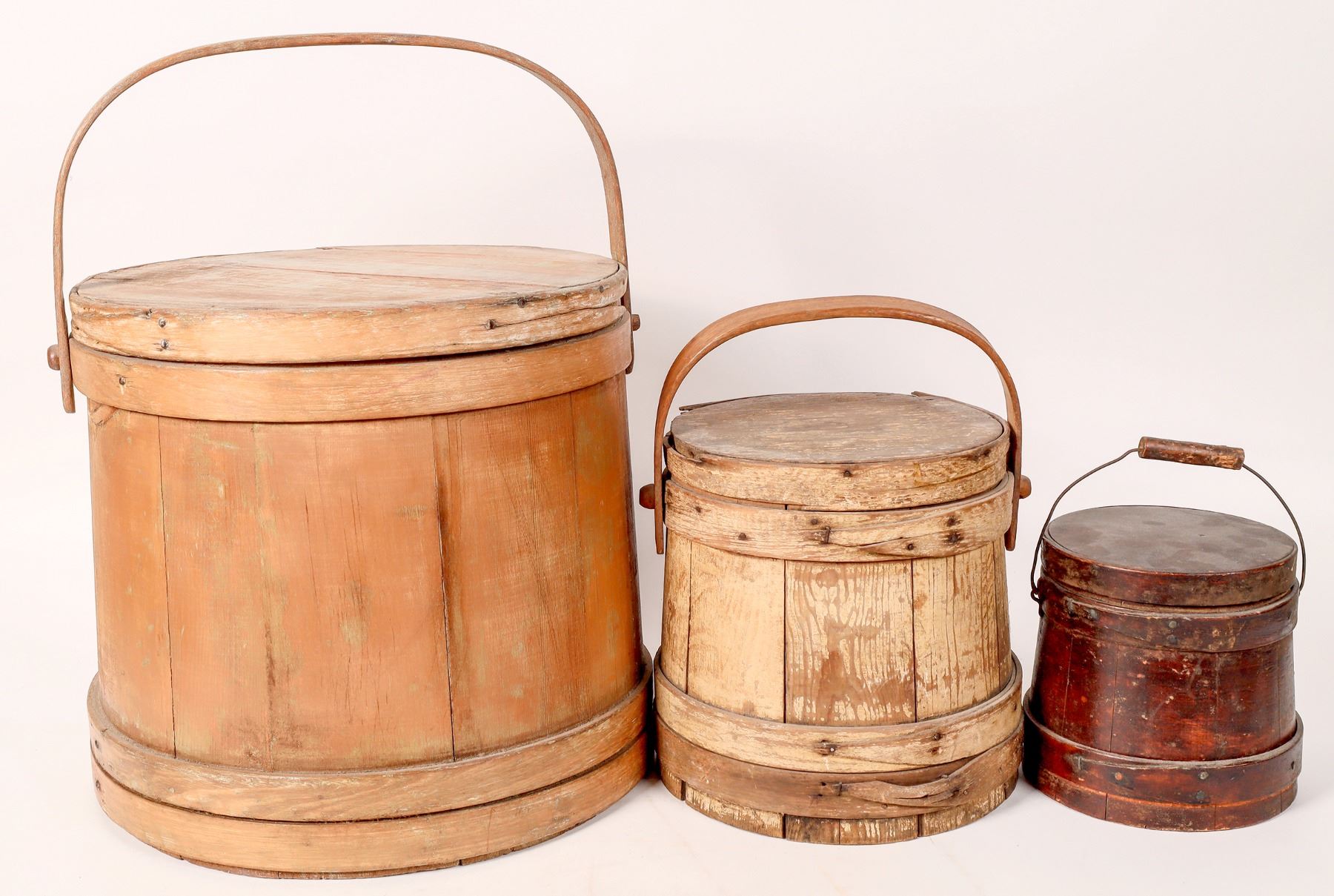These are made of wood and measure 13.75"x 14", 9"x 9.5" and 6"x 6.75", They are very nice condition, considering their age, but their water carrying days are over. Please see photos for more details. Chicago Illinois Gary Bracken Collection