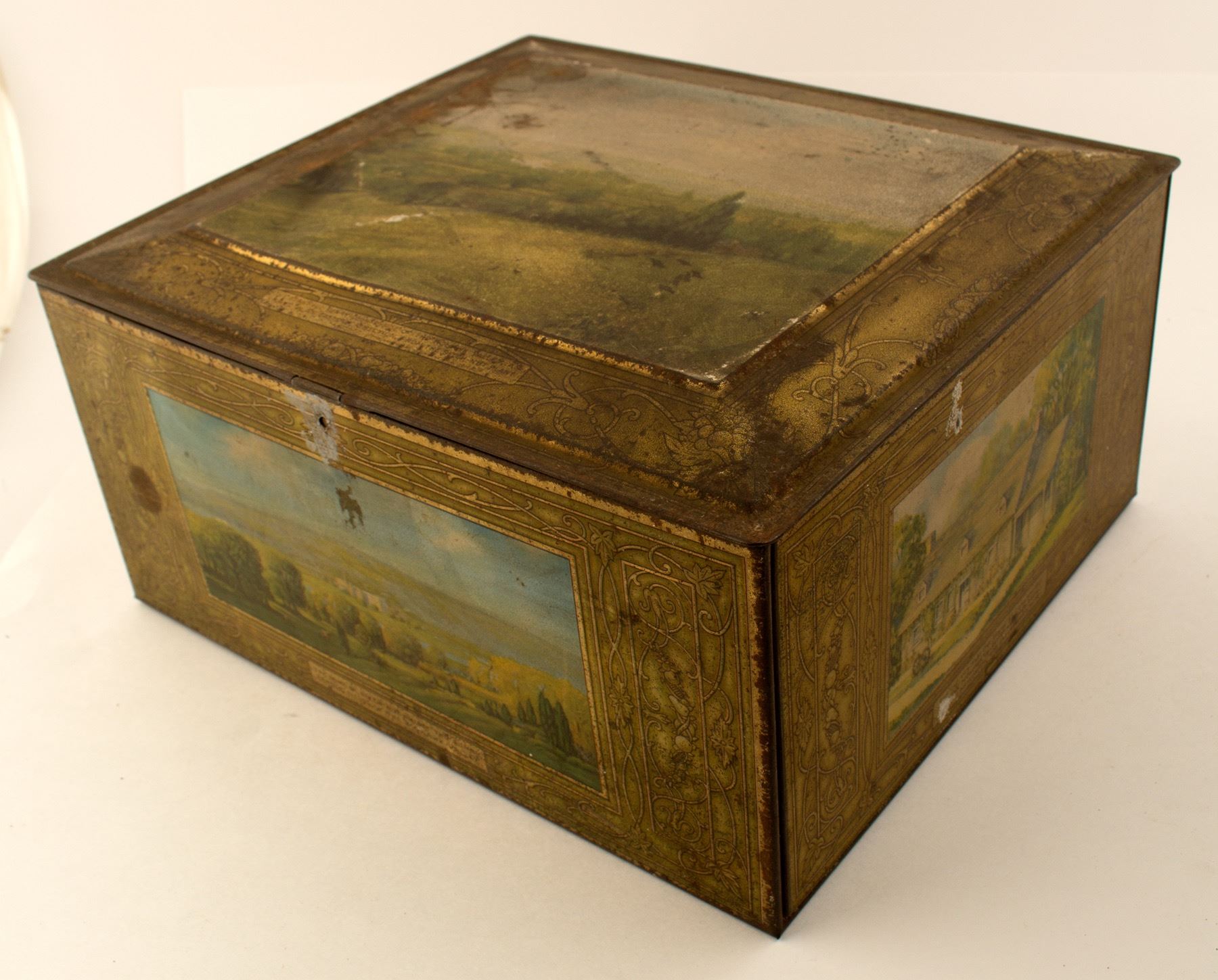 Vintage metal Beech Nut box, approx 12 x 11 x 5 inches. Brass lining on interior and hinged top. Scenes on all sides and top including Canajoharie, NY, Mohawk Valley and Old Van Alstyne house.