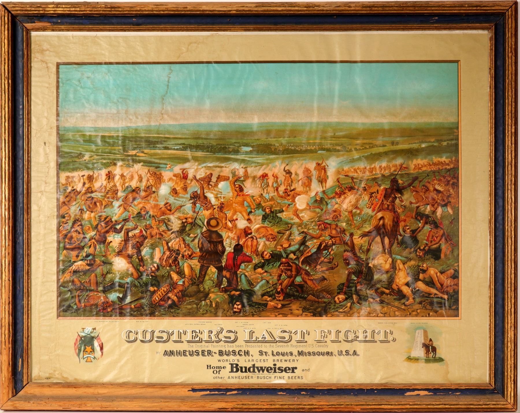 According to our consignor, this piece came out of the Old Water Company Building in Virginia City on B Street 50+ years ago. It measures 31 ½ x 41 ½ inches sheet, 38 ½ x 49 inches framed. Chromolithograph . Toning consistent with age, stains (see photos) chip from bottom edge under the word "Fine" of "Home of Budweiser and other Anheuser Busch Fine Beers." Colors are still unusually vivid, compared to other pieces seen in the collector's market place. Large tears in center of print that measure several inches. The piece is still encased in the original glass faced navy blue and metallic bronze/gold colored wood frame, but the paint is peeling badly and the wood is dry and cracked. The glass is still intact. The paper on the back is pulling away from matte, and ripped in a few small places, but still intact. Small margin directly under picture reads: "Entered According To Act Of Congress By Adolphus Busch March 30th 1896 In The office of The Librarian Of Congress At Washington, D.C." The following note appears under the image with the Title: "The Original Painting has been Presented to the Seventh Regiment U.S. Cavalry By Anheuser Busch Brewing Association, St. Louis, Mo. U.S.A." . Anheuser-Busch introduced this piece to commemorate the Battle of the Little Bighorn. Based on the 1884 painting of Custer's Last Stand, by Cassilly Adams, this chromolithograph is one of the oldest and most well-known pieces of American Breweriana extant. In her work Adams captured the iconic Battle of Little Big Horn that took place on June 25-26th, 1876 near the Little Bighorn River in Montana, during the Great Sioux War. Shown are the American 7th Cavalry Regiment and the Lakota, Northern Cheyenne, and Arapaho tribes with General George Armstrong Custer in the center of the composition, standing tall and waving a saber, surrounded by violence, his cavalry clearly outnumbered. His brother, Tom Custer, also appears in the composition already defeated in battle. The Lakota, Northern Cheyenne, and Arapaho fighters are armed with scalping knives, tomahawks, clubs, spears, revolvers and rifles, while more appear to be arriving on horseback from the background.The vivid colors and striking details in facial expressions and costumes further heighten the drama and emotional intensity depicted in this print. Anheuser-Busch was founded in 1952 in St. Louis, Missouri. In 1876, the company introduced Budweiser, which became the first national beer brand of the United States. In the 1880s and 1890s, Anheuser-Busch launched a series of marketing campaigns in which they produced items such as corkscrews, pocketknives, postcards, and prints bearing their brand name--the present chromolithograph was the most iconic of these items, eventually becoming "one of the most popular pieces of artwork in American history" (Herbst, 38). Reference: Henry Herbst, "St. Louis Brews: 200 Years of Brewing in St. Louis, 1809 - 2009," (St. Louis: 2009) Catalogued by Xueli Wang, Columbia University, BA; Courtauld Institute of Art, MA.