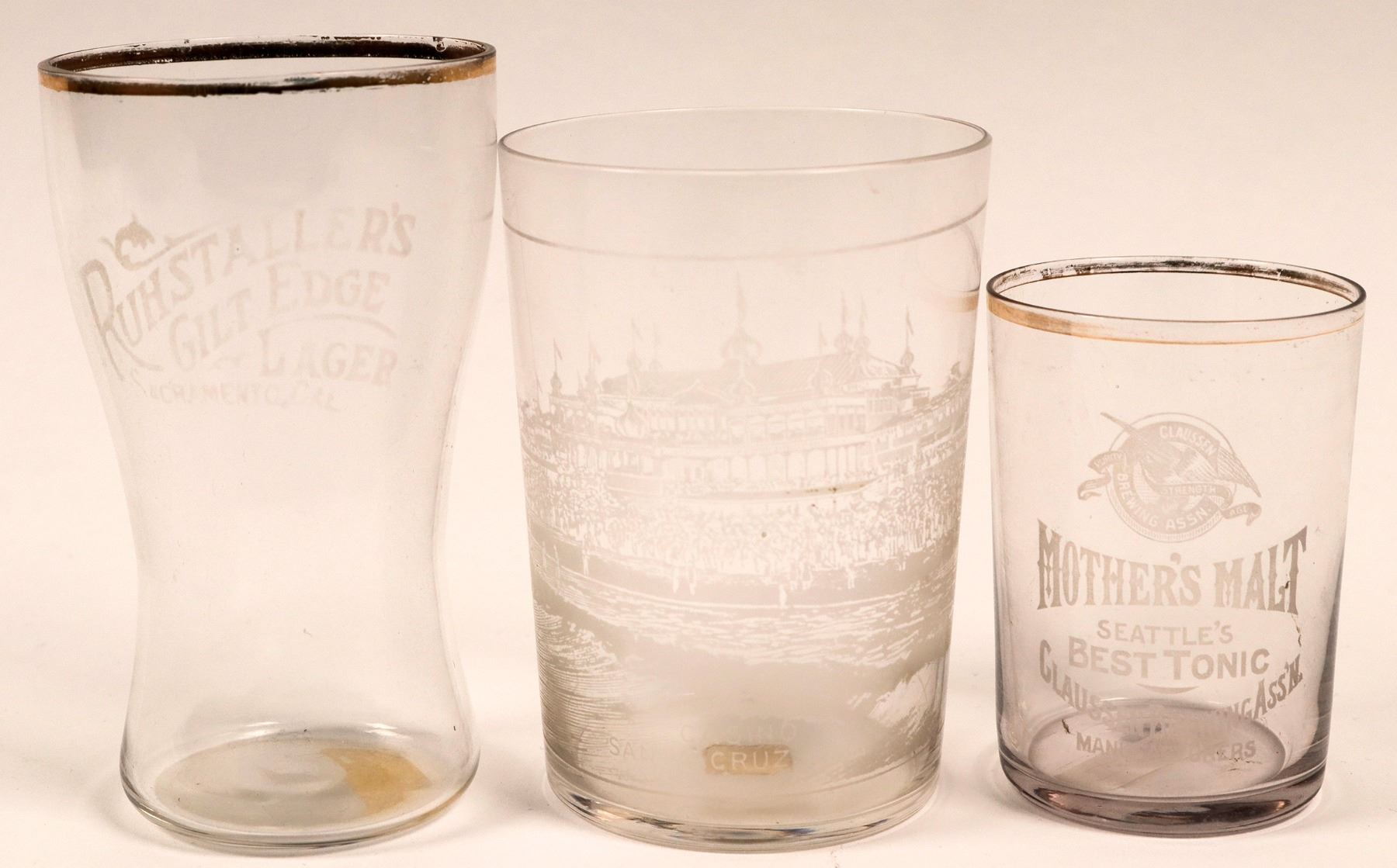 Three vintage etched beer glasses from central California: Claussen Brewing co. (San Jose); Ruhstaller (Sacramento); Casino, Santa Cruz.