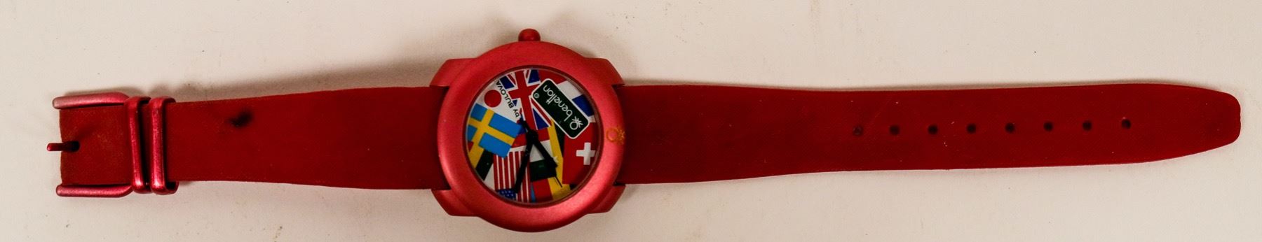 Rare, vintage United Colors of Benetton by Bulova, "Time of the World" flag watch, c1980s. Flags from around the world on face. Pre-owned, but in good condition. Needs battery.
