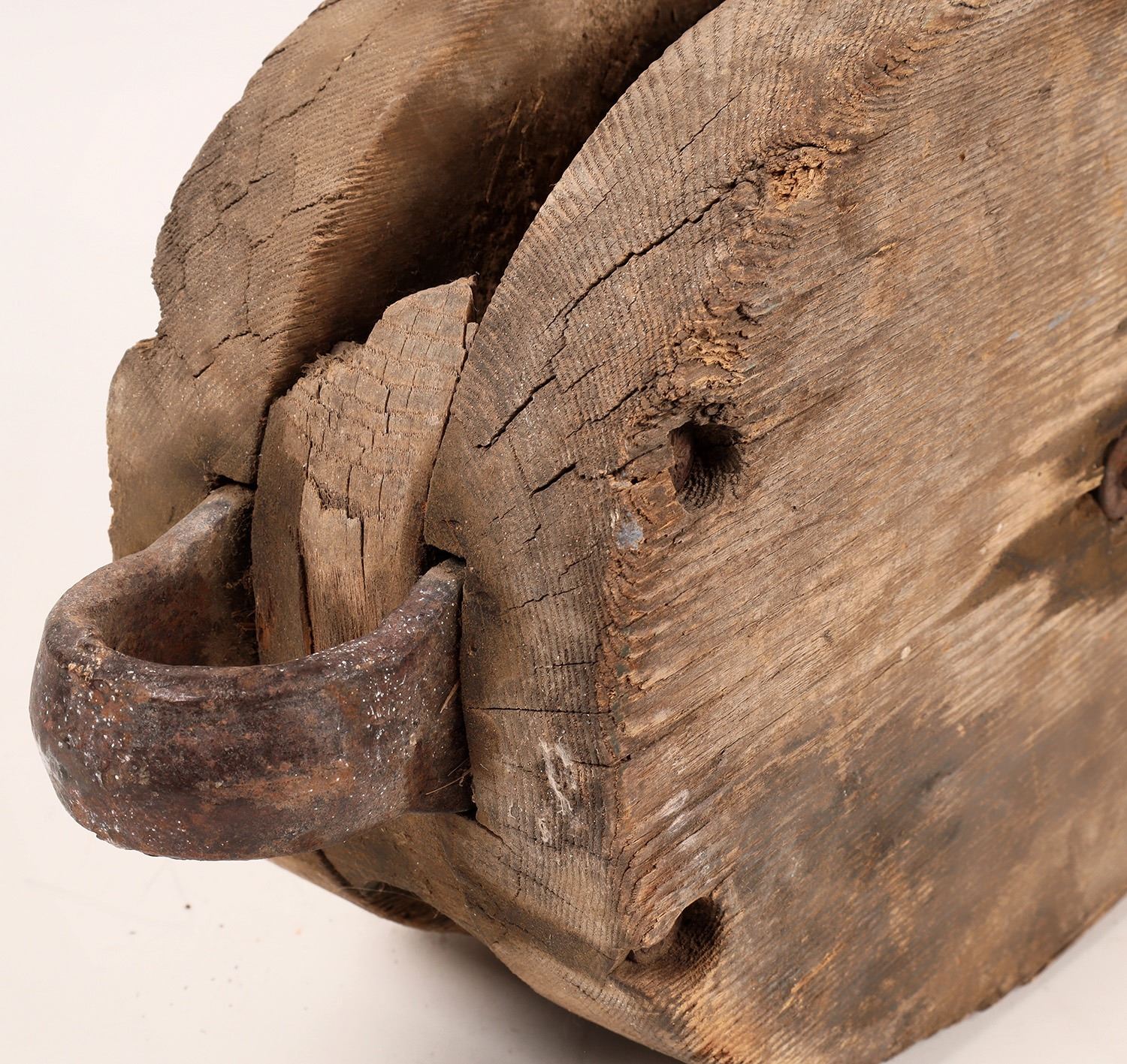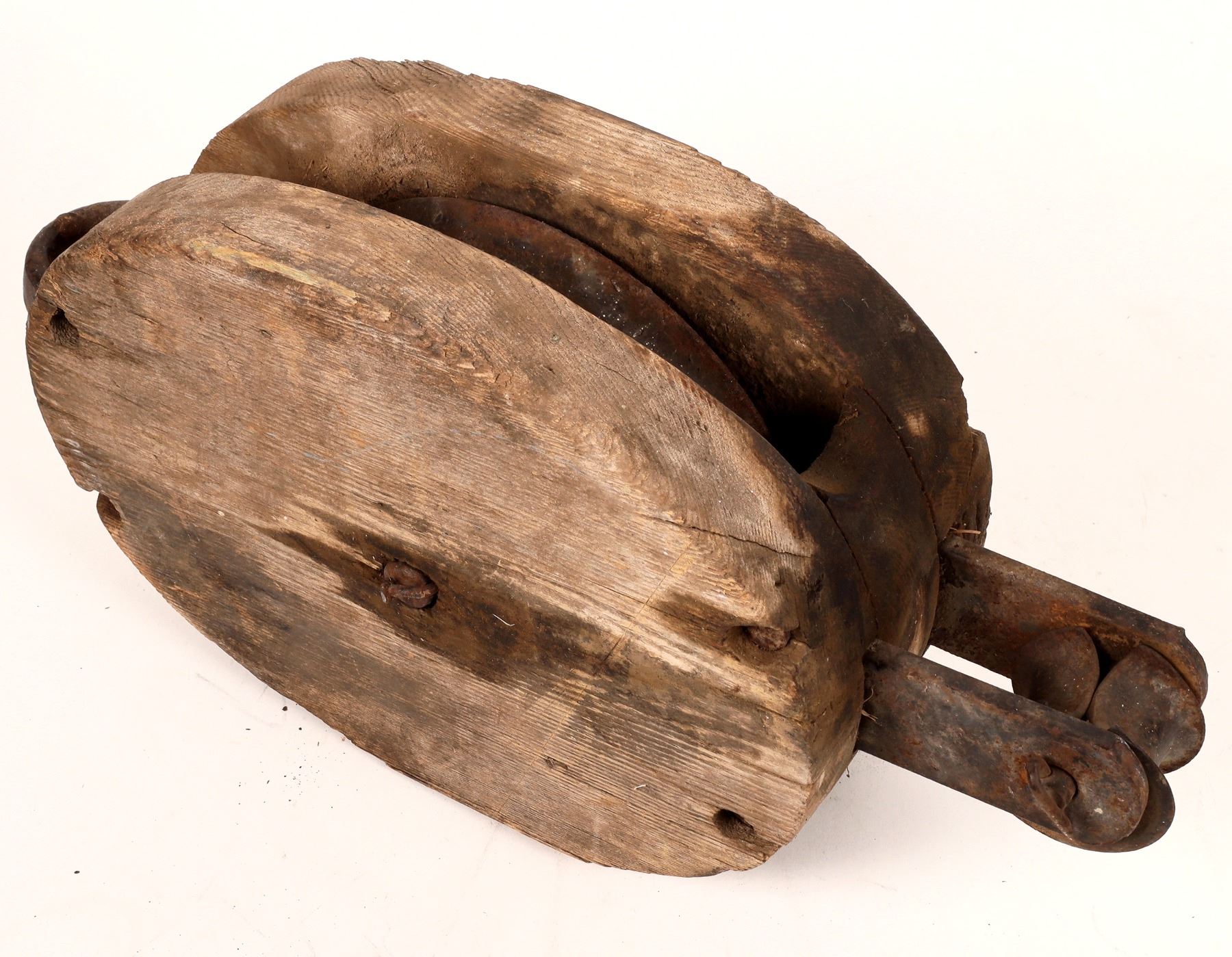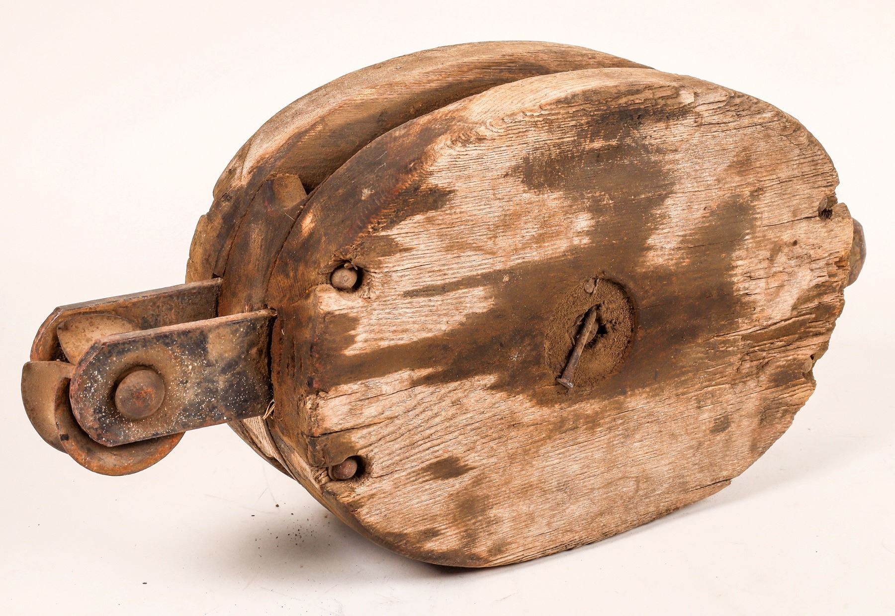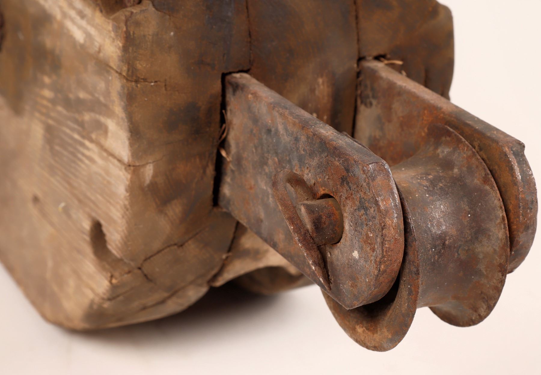 Vintage block and tackle. Will make a nice addition to a rustic tool display. 13x8.5x5". About 15 lbs.