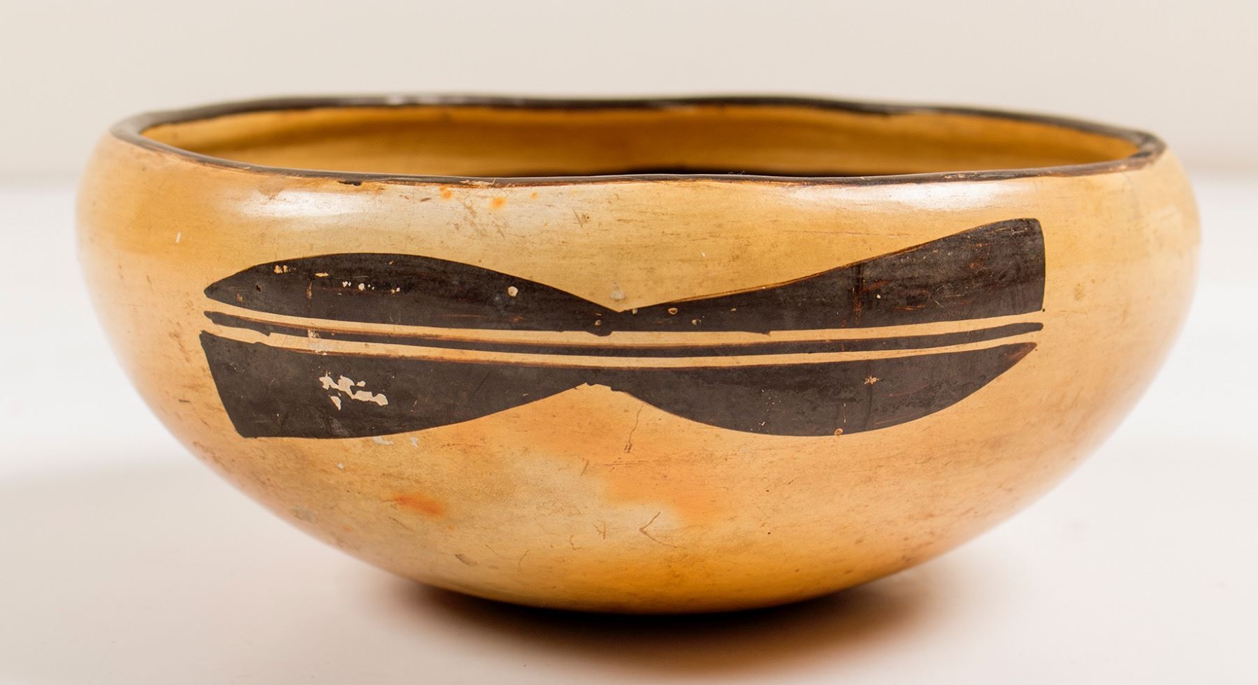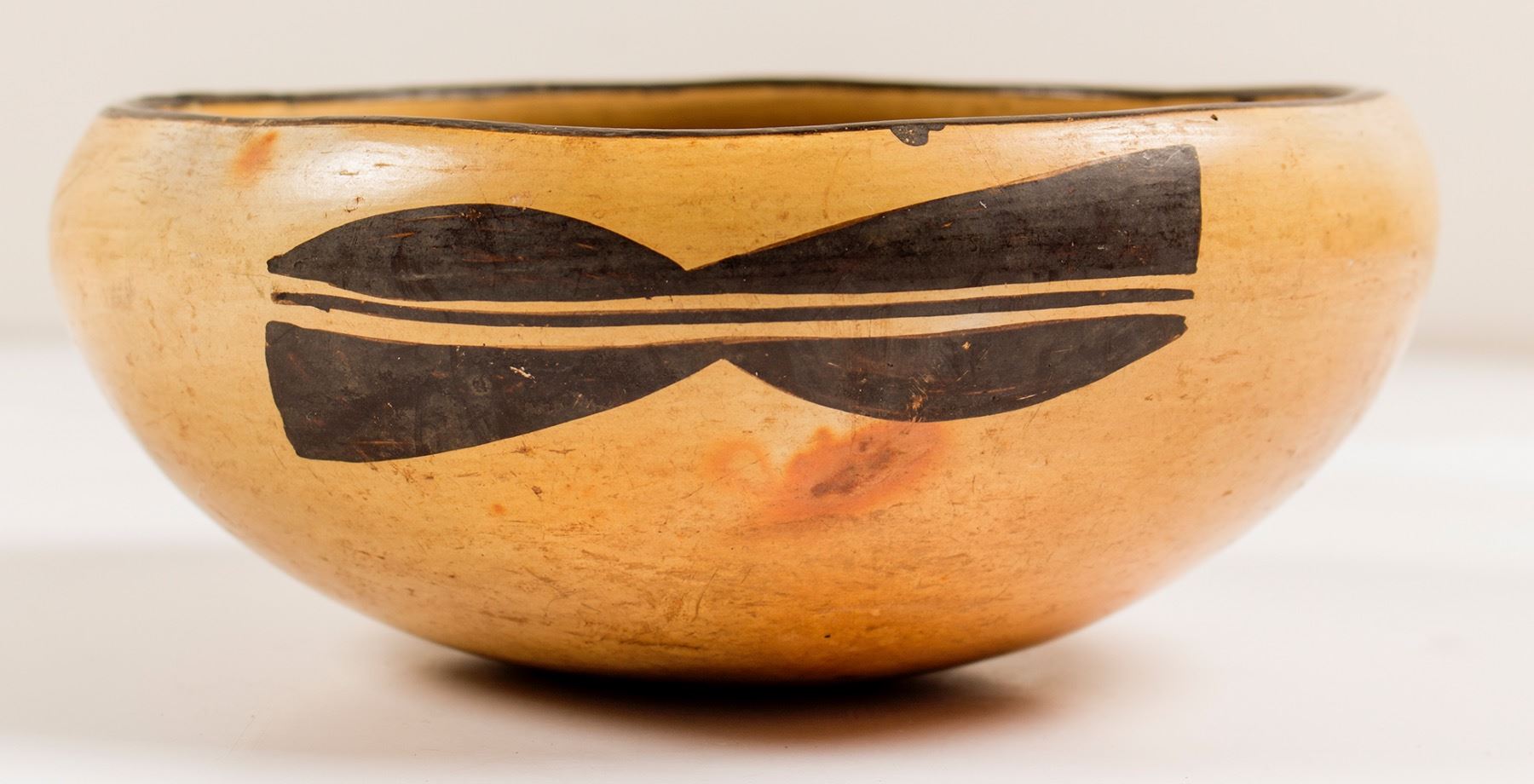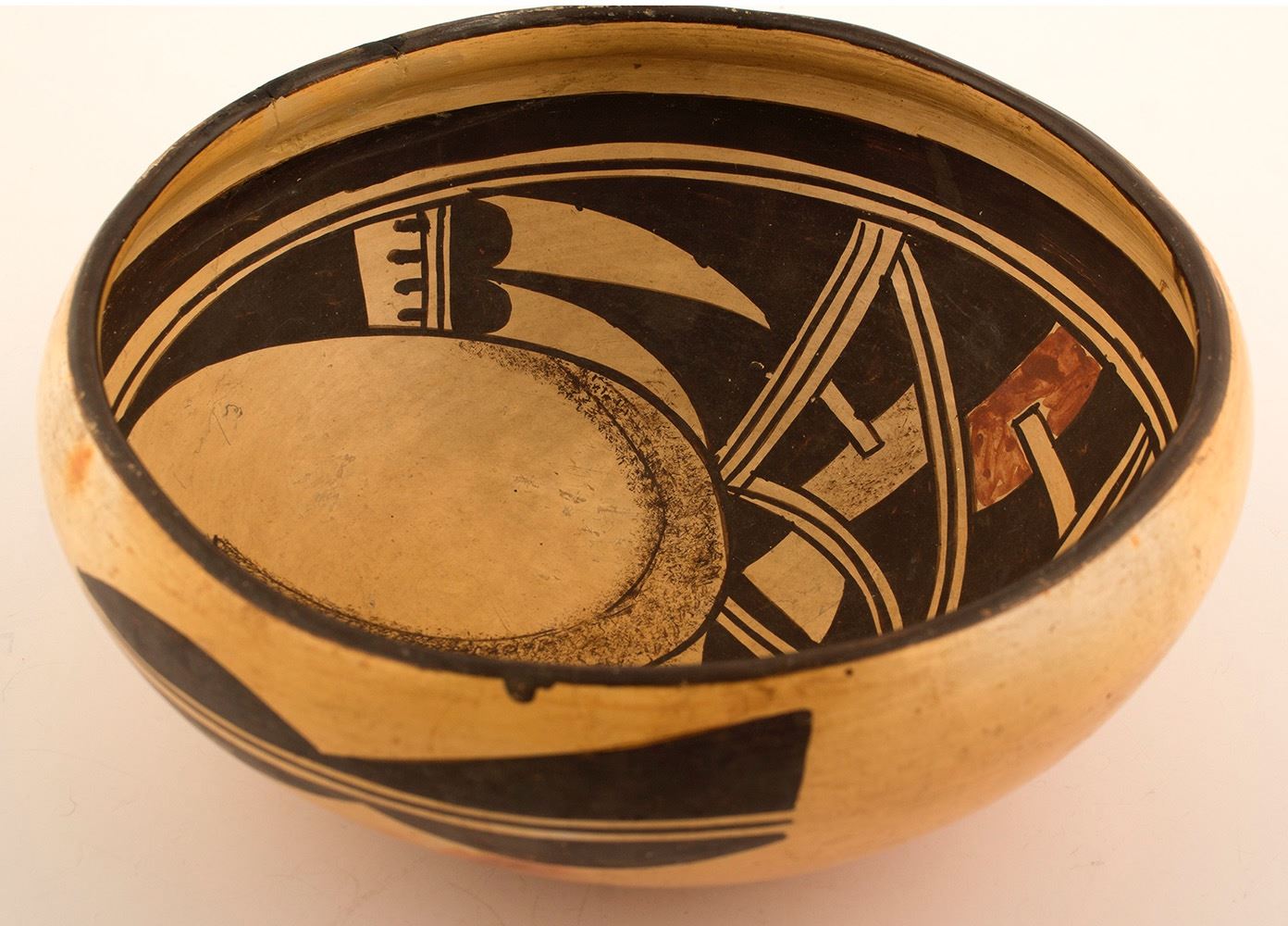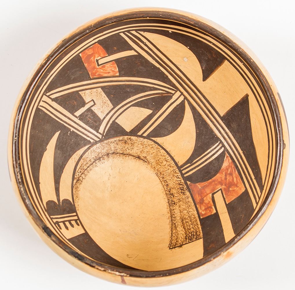Vintage bowl w/ interior design. Bird figure on the inner bowl with a wide sky band, nice detail with stippling. 3.25" h x 7.5" diameter. Some small chipping on outside of bowl. Date: c.1940 Location: Hopi, Arizona HWAC # 49778