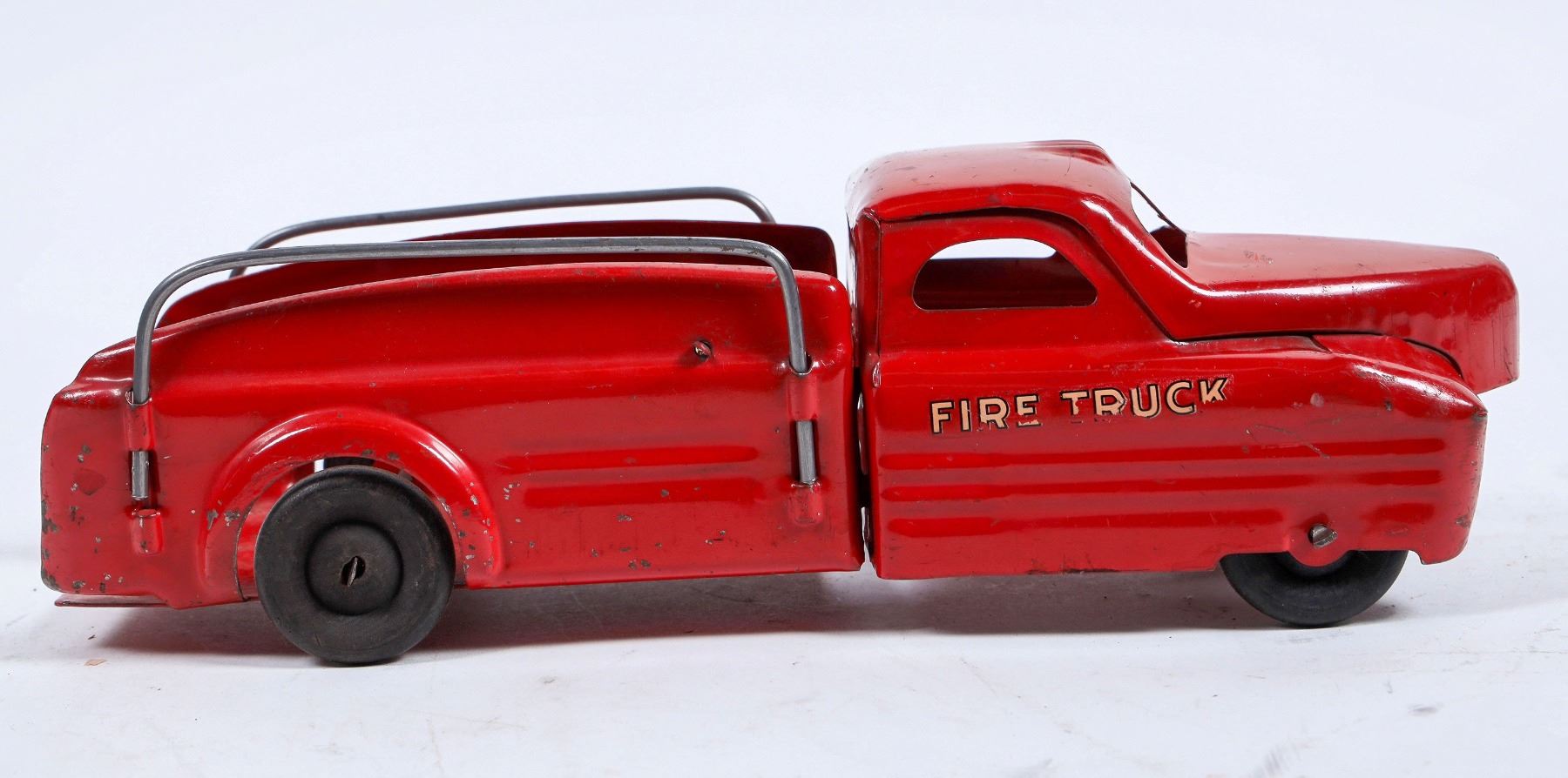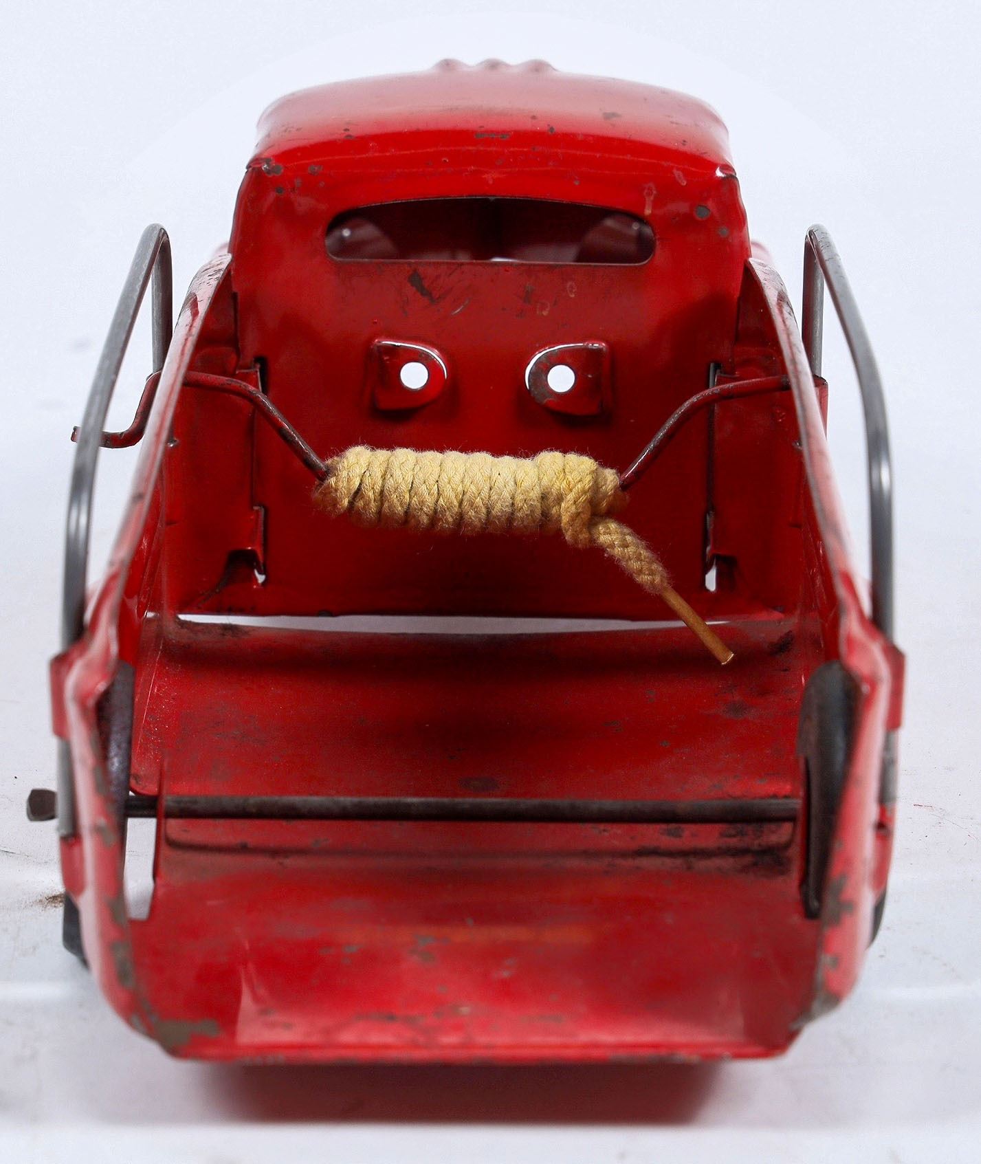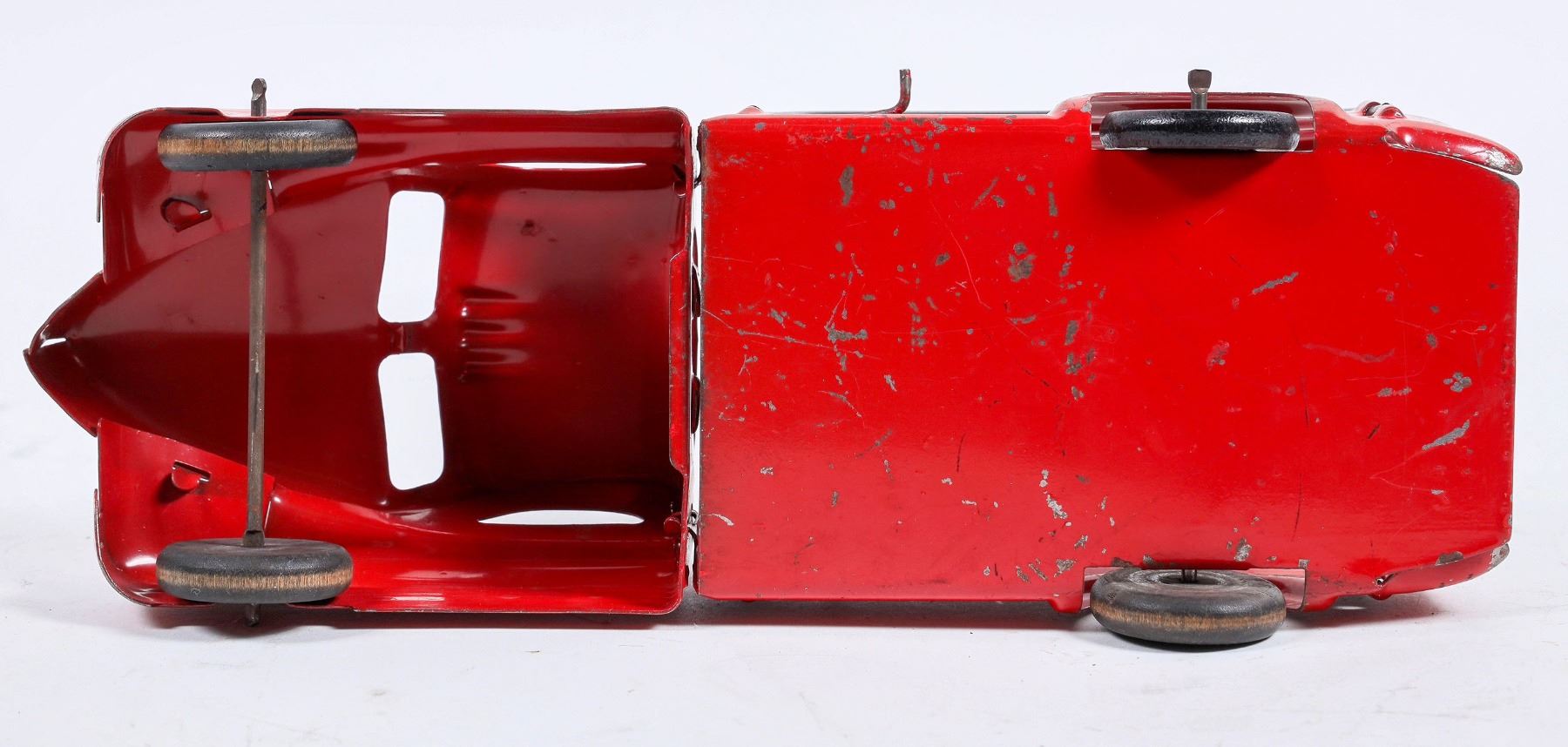Buddy-L Fire hose truck, pressed steel. Red. Graphics are worn. Light Play Wear. No Dents. 17” L