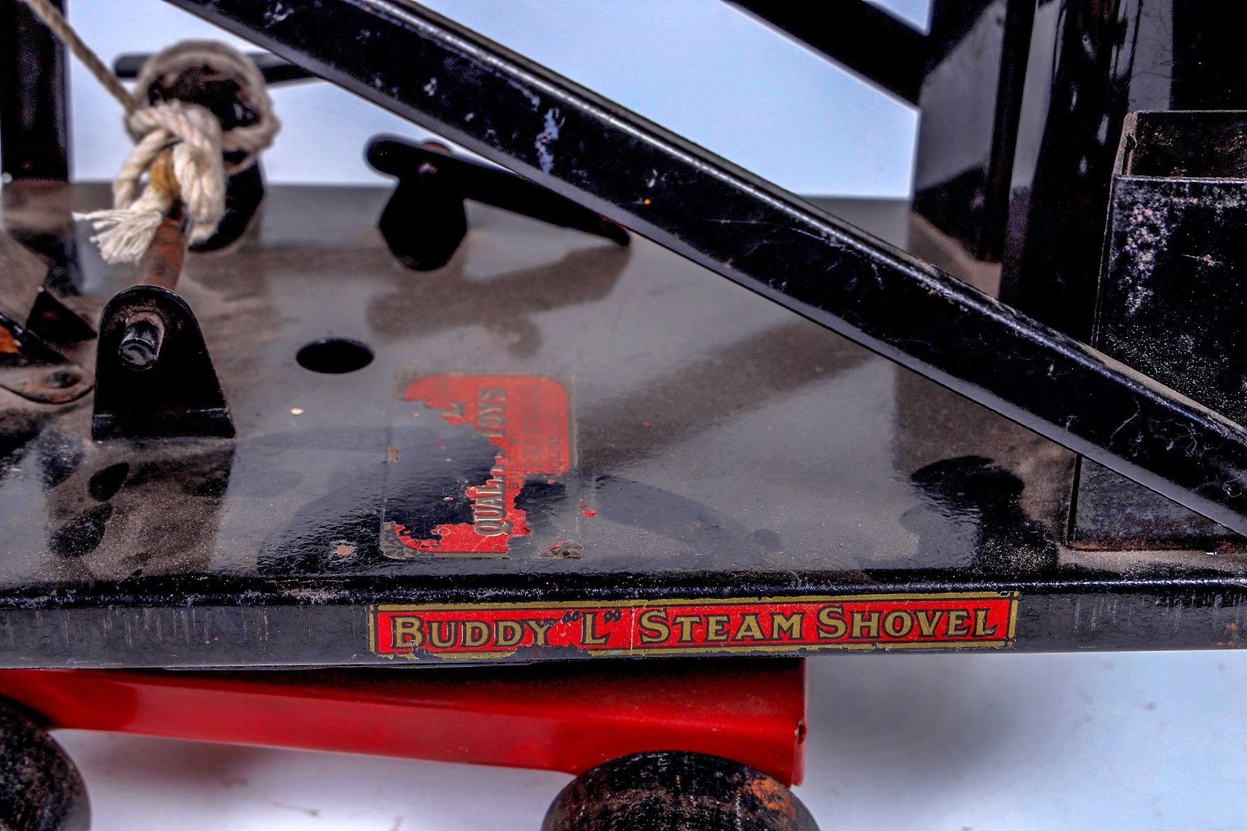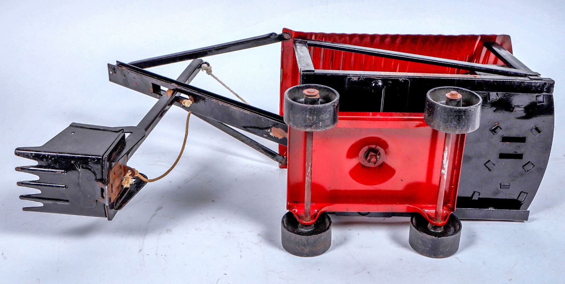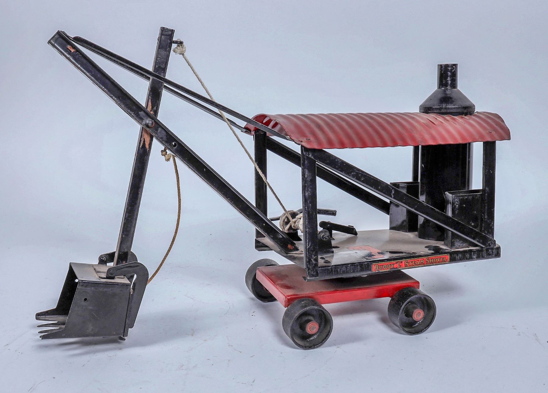 Buddy L Steam Shovel. Pressed Steel. Shows Play Wear. Graphics are Worn. Operable. Color: Red/Black . Good Condition. 22x15." 26” with shovel extended
